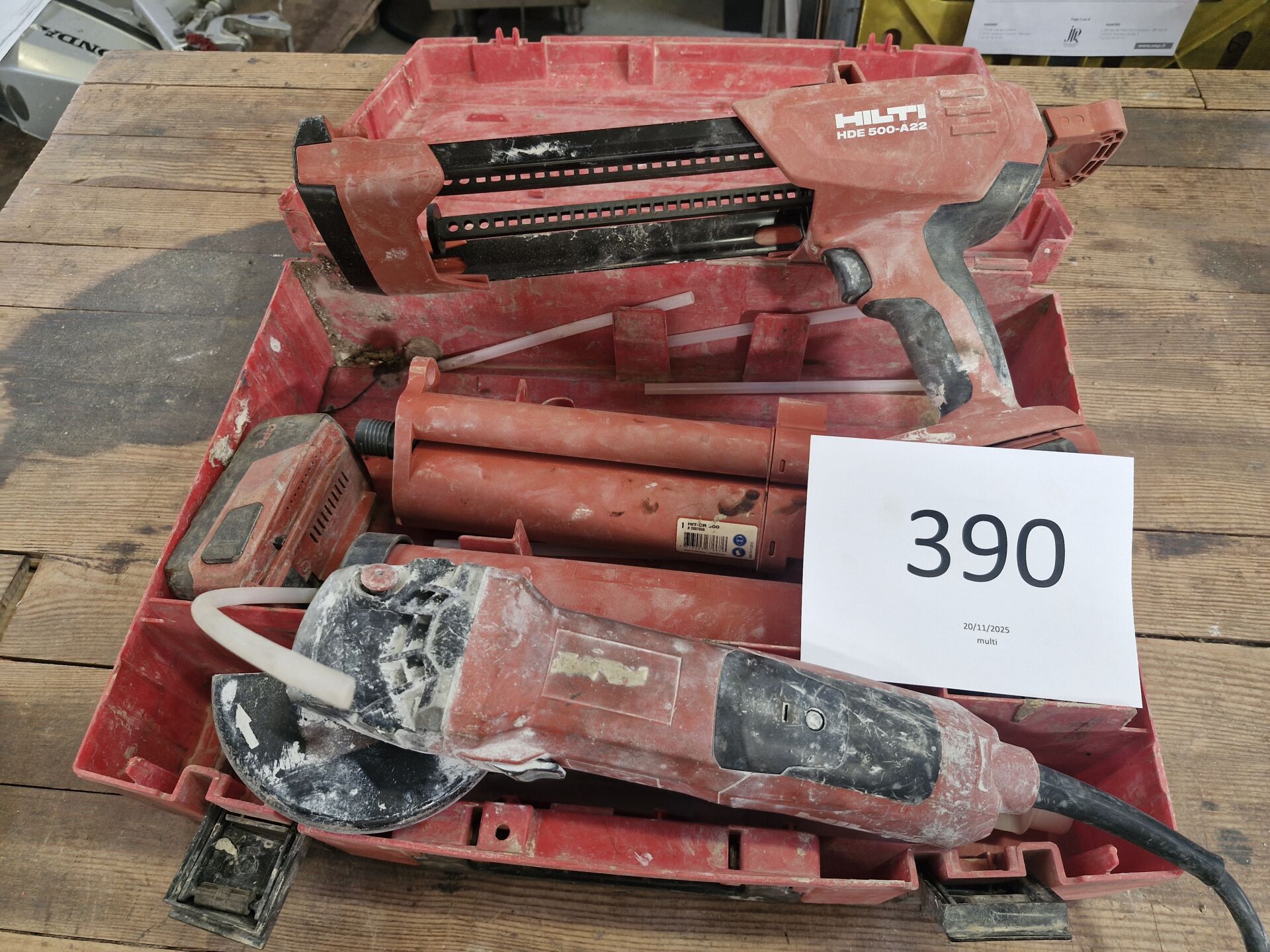 1 meuleuse d'angle HILTI AG 125-19SE N/S:19002113, 1 pistolet à scellement autonome HILTI HDE 500-A22 2 batterie sans chargeur, mise sous tension le 22/10/25, expédition possible pour 43,98€