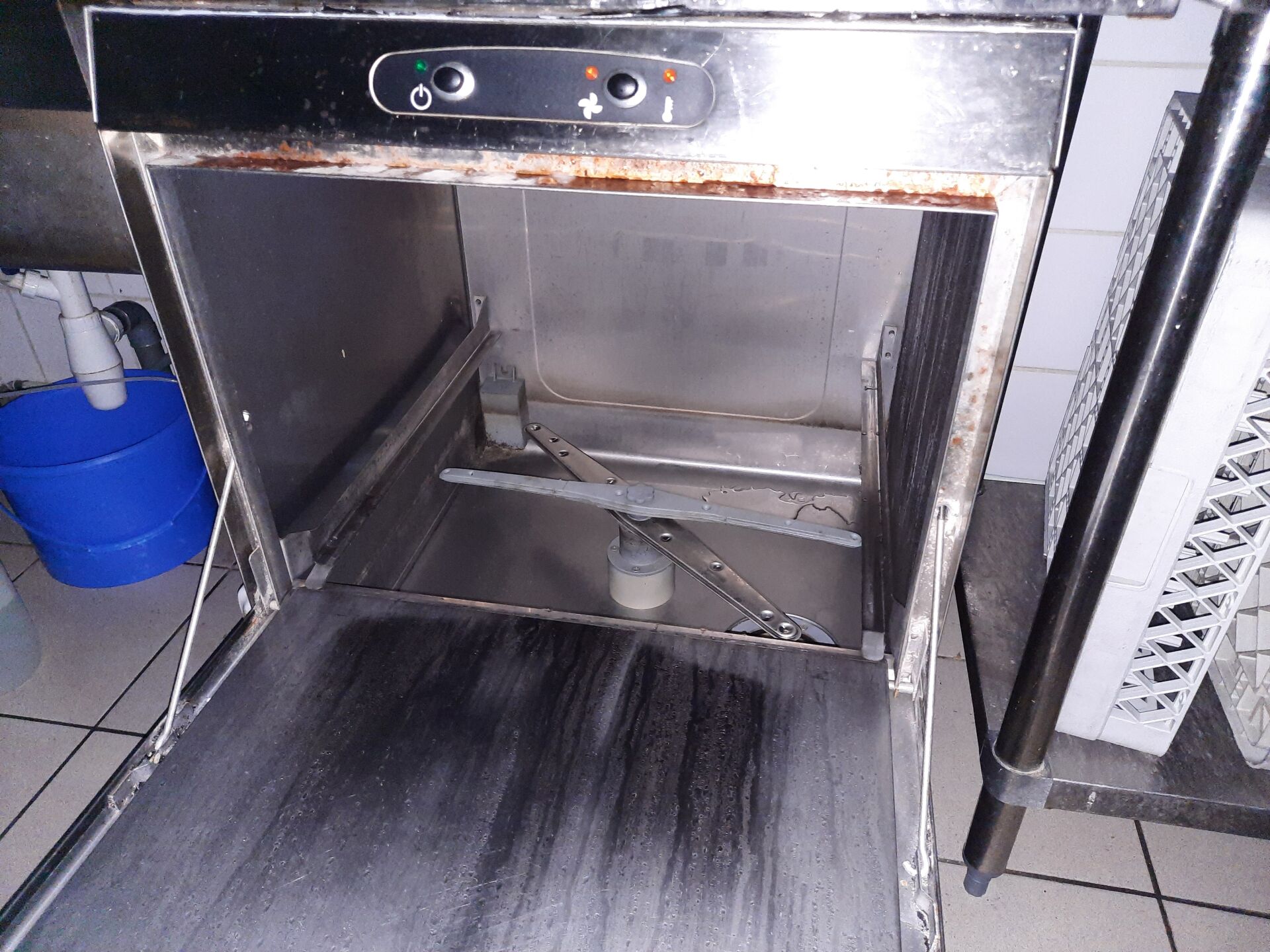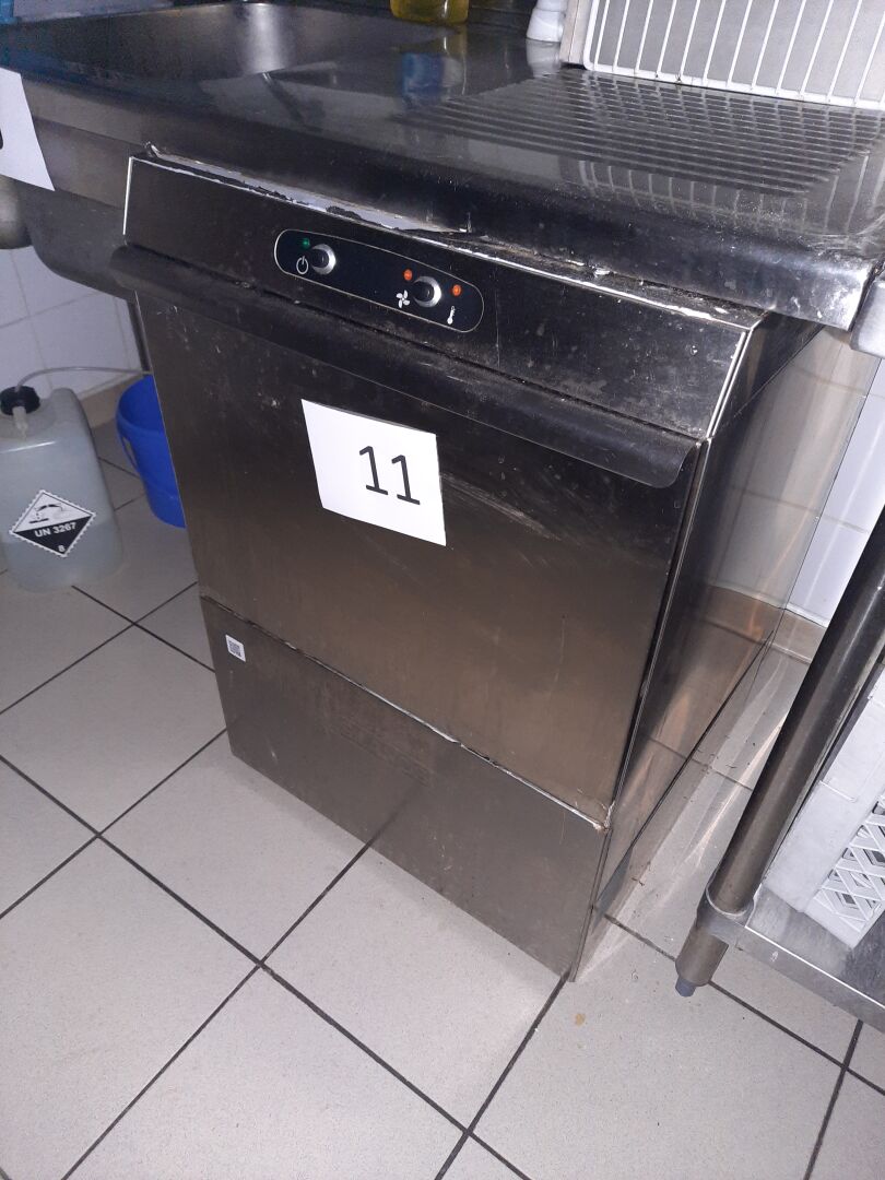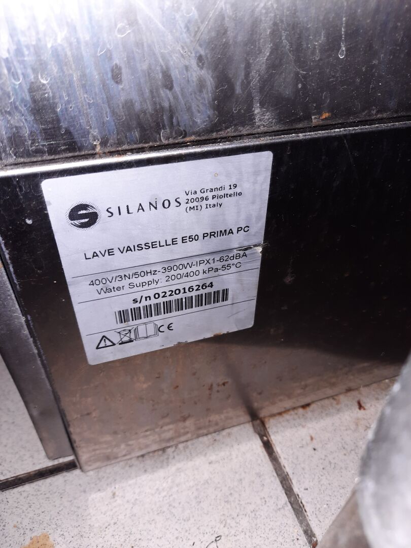 Lave-vaisselle en inox SILANOS modèle E50 PRIMA PC. 380V On joint : 2 bacs 50x50 cm A DEMONTER PROPREMENT SANS DOMMAGE A L'IMMEUBLE ET EN RESPECTANT L'ETANCHEITE DU BATIMENT. PREVOIR BOUCHON.