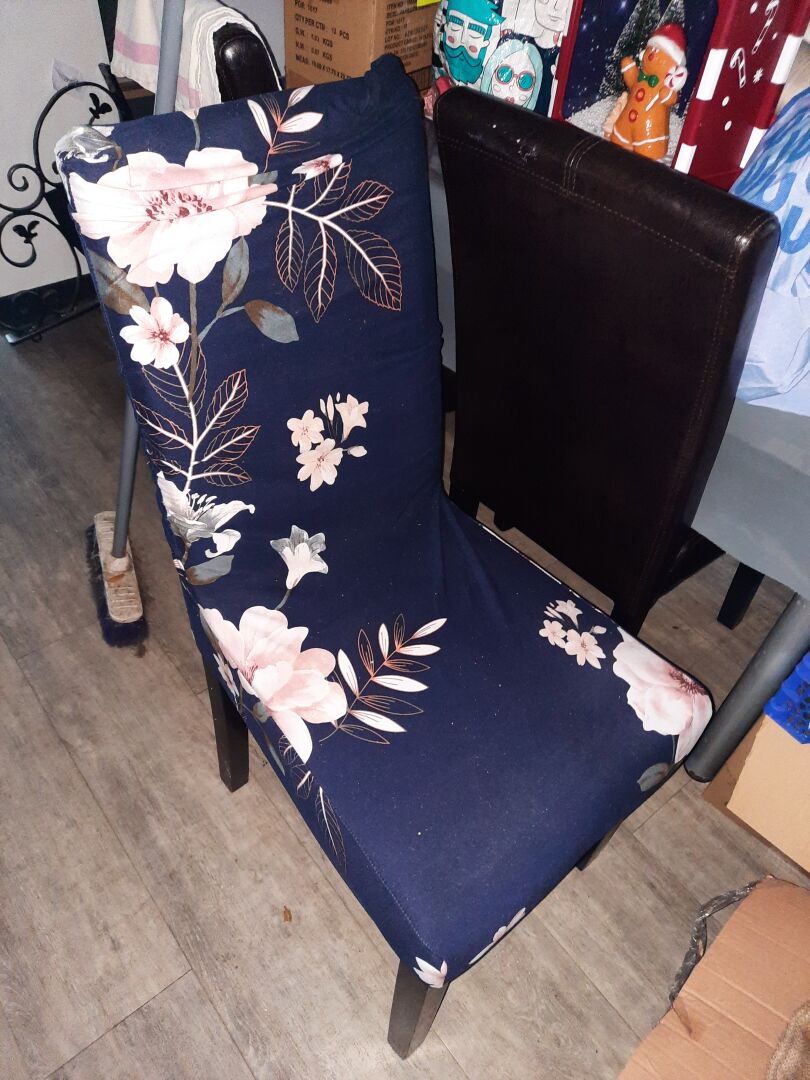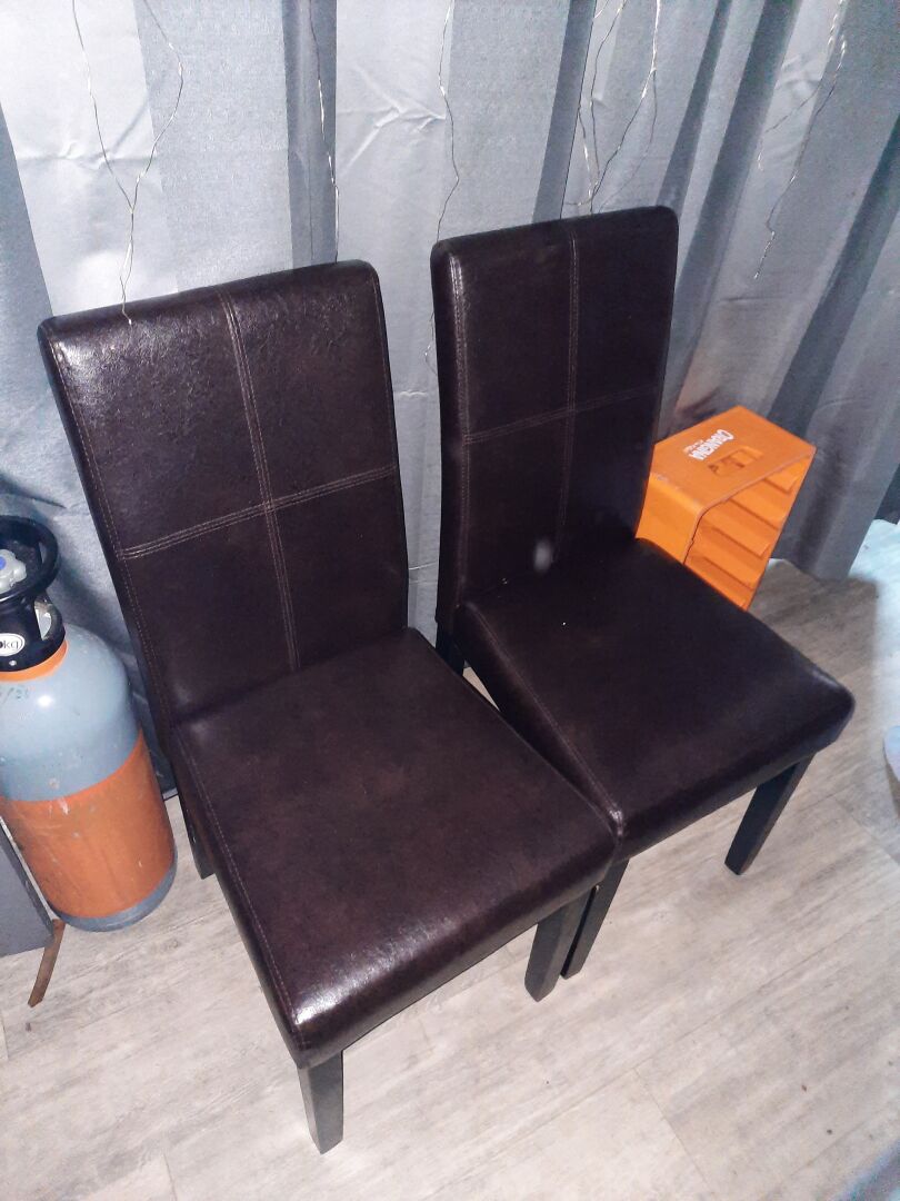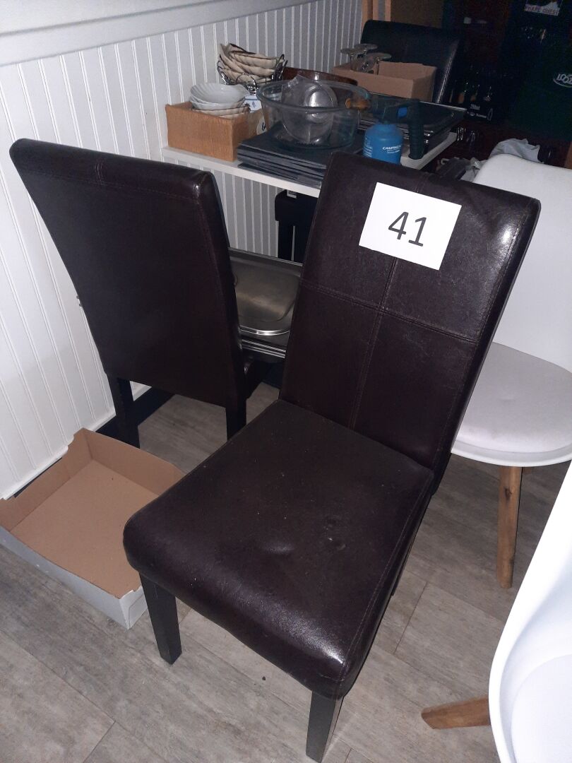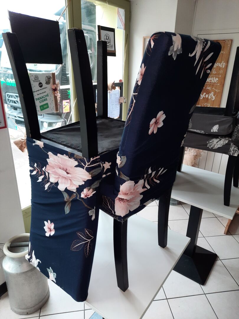 22 chaises, assise en simili cuir noir (certaines houssées de tissu fleuri) 3 chaises en bois naturel, assise paillée