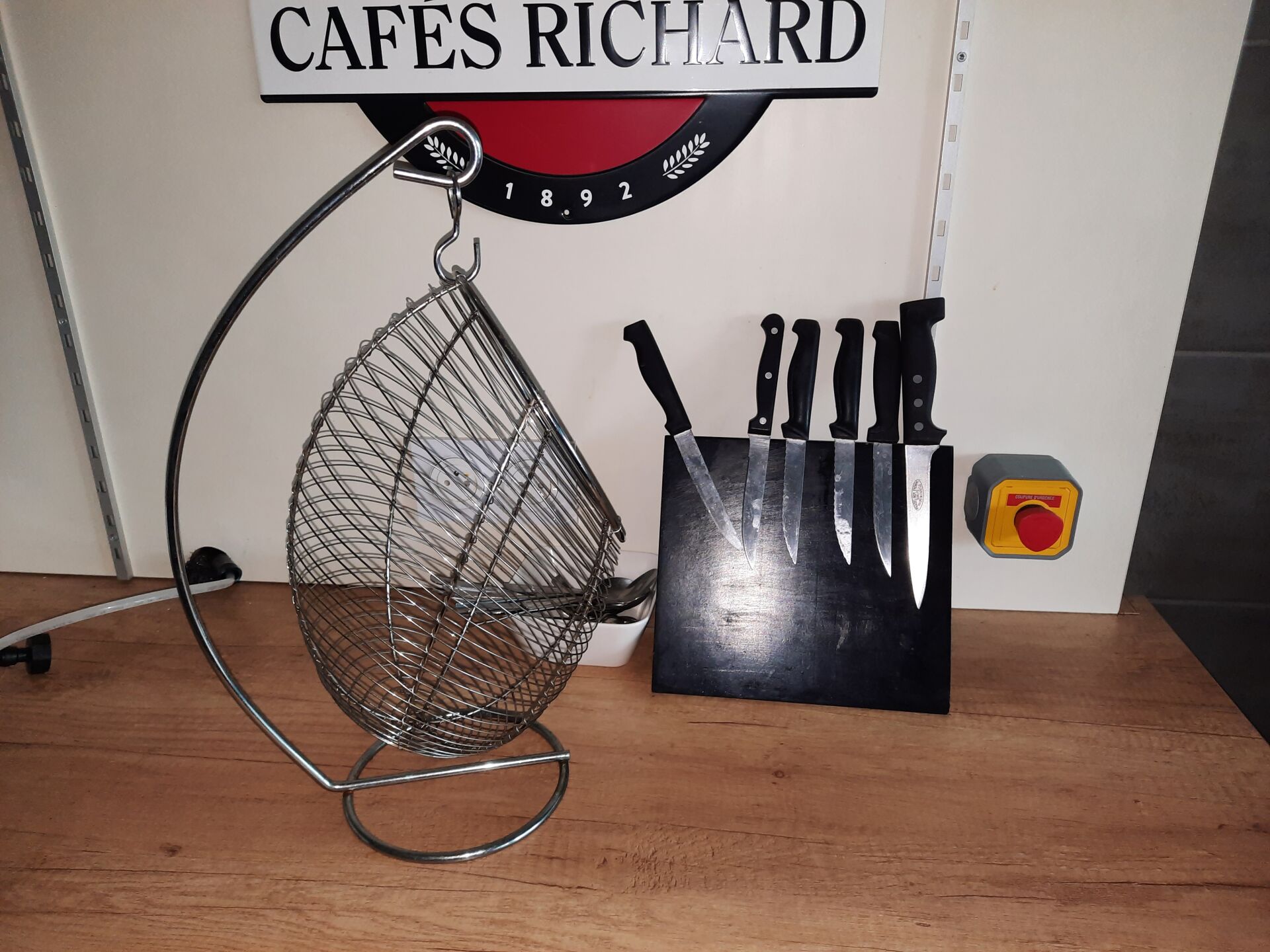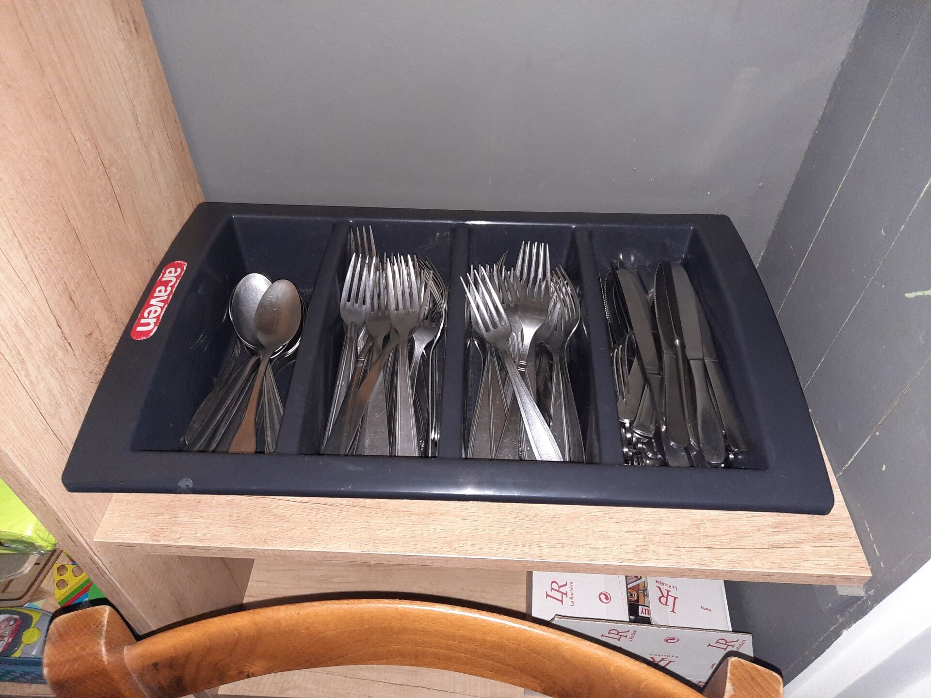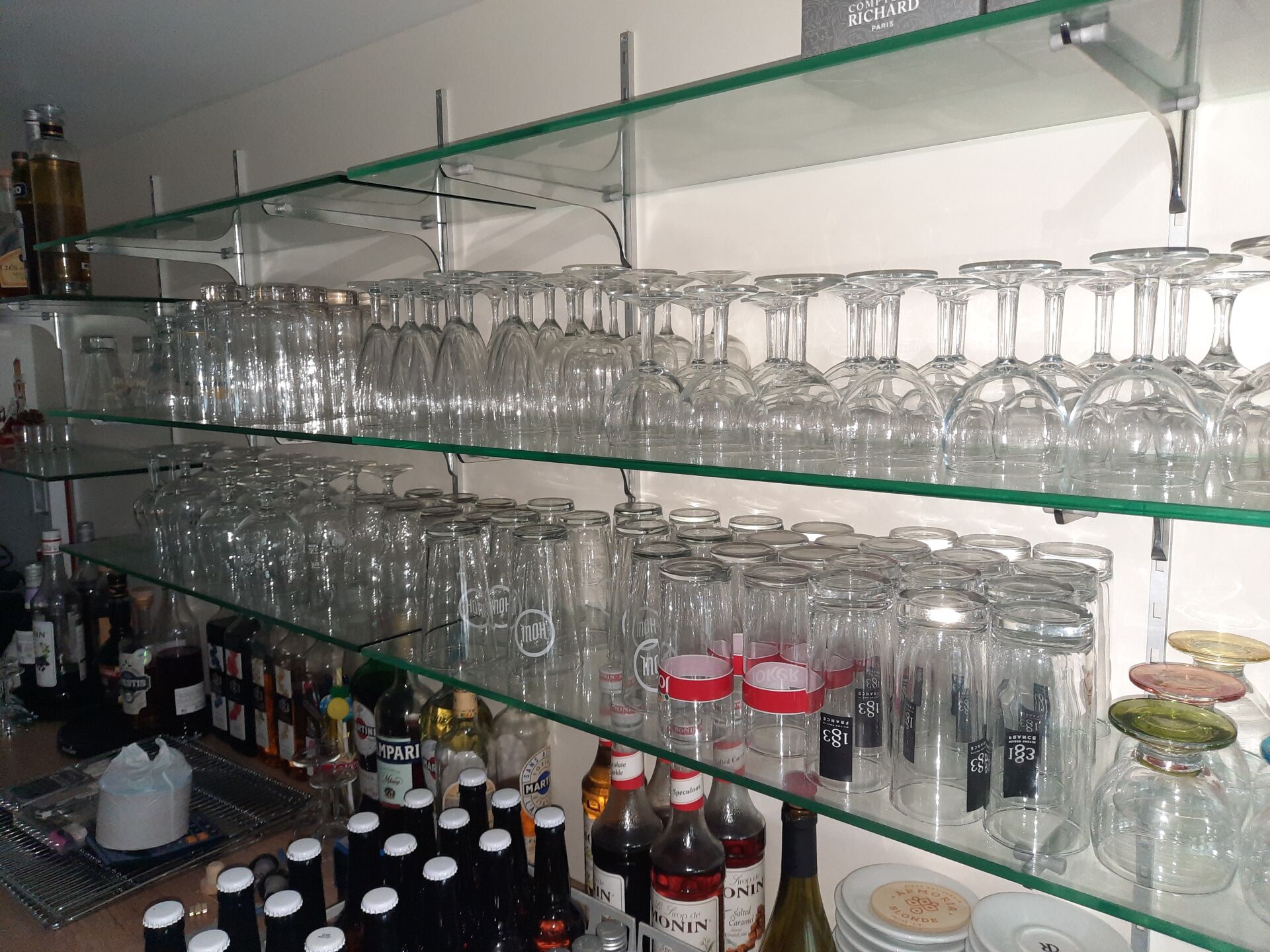 Environ 60 assiettes en faïence blanche Environ 60 couverts en inox Environ 60 verres dépareillés On joint : Présentoir à Orangina