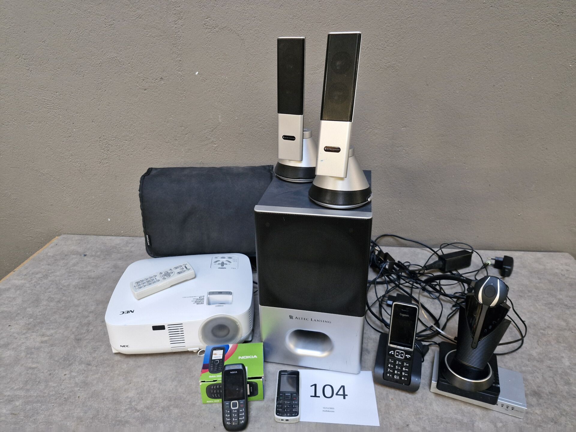 1 téléphone mobile NOKIA 1616 1 téléphone mobile NOKIA 1 téléphone autonome GIGASET, 1 casque, 2 switchs 1 vidéo projecteur NEC VT 49 avec sacoche Système audio ALTEC LANSING VS4221, comprenant : 2 mini-enceintes , 1 caisson de basse