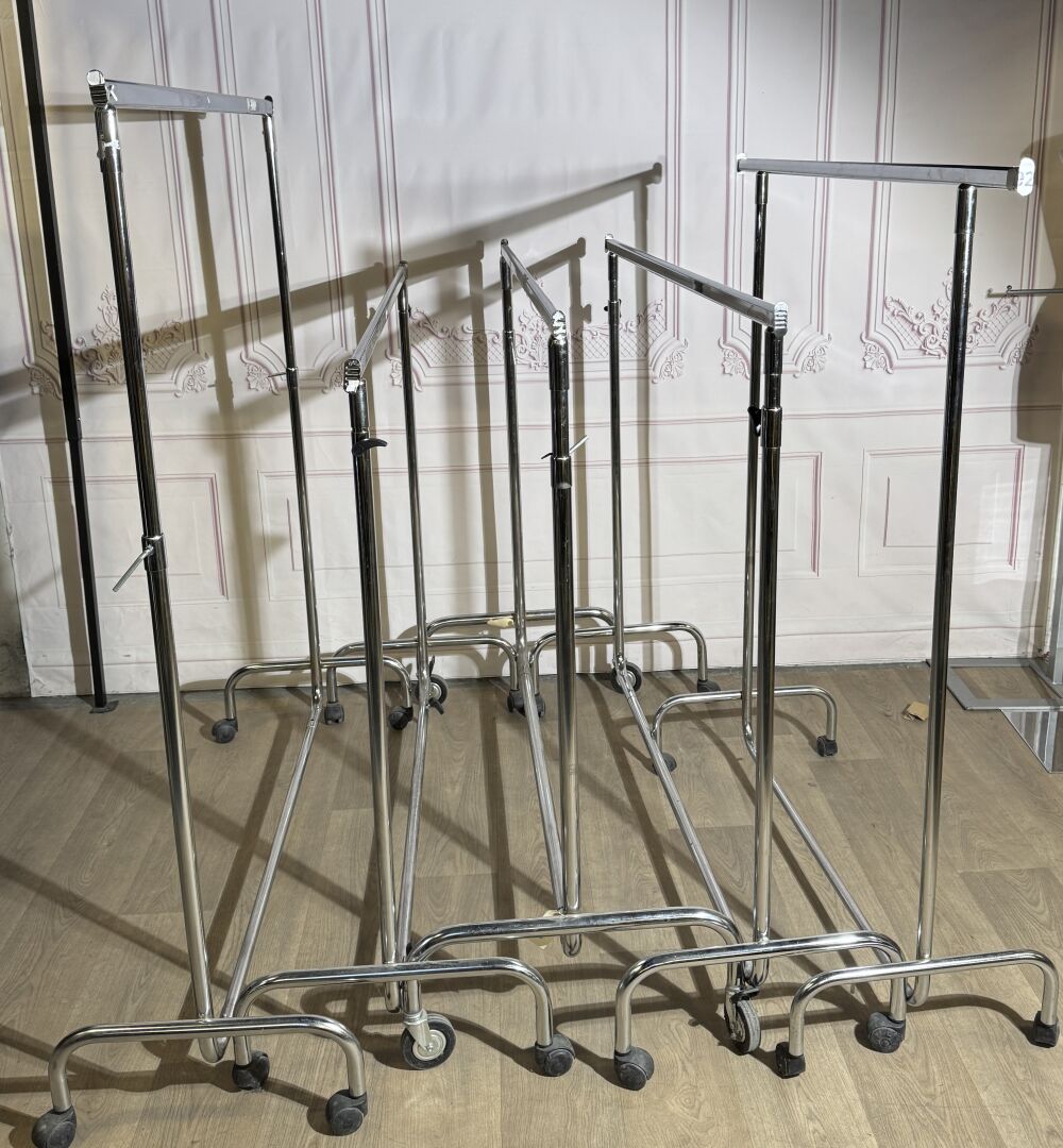Lot de 7 portants mobiles, hauteur ajustable, acier chromé.