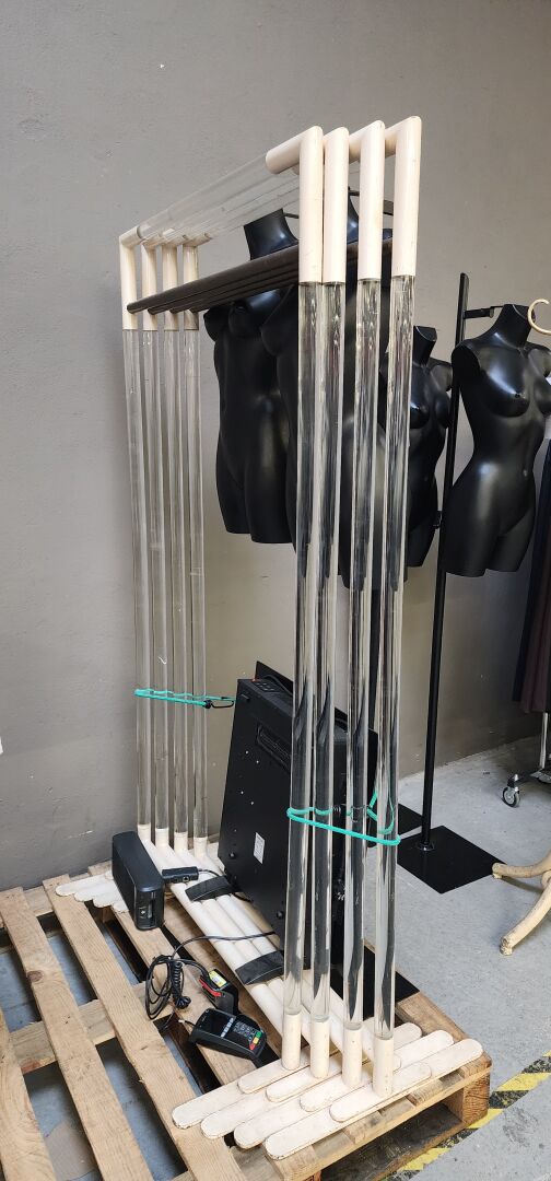 4 bustes de femme plastique sur piètement métal 1 radiateur EVATRONIC 1 porte manteau bois 4 portants métal / plastique