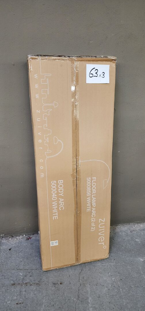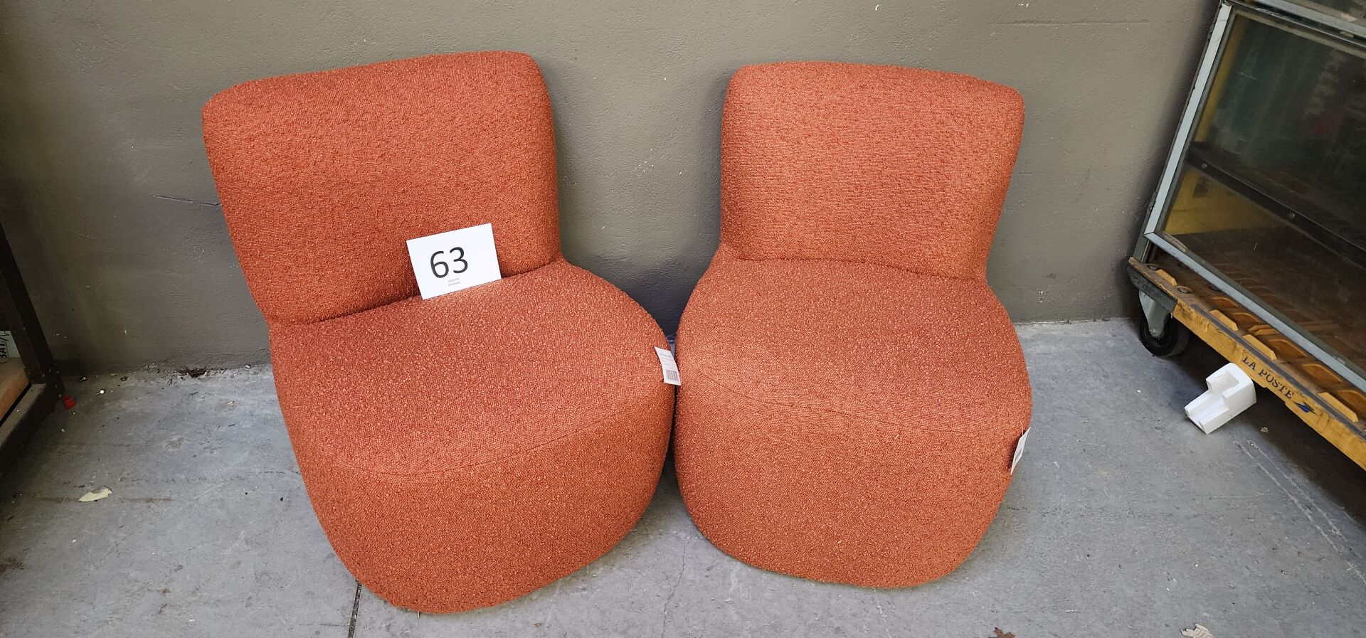 2 fauteuils Eve OBJET PARIS en tissu bouclette rouille 58x73x71cm, 1 lampe à pied ZUIVER arc floor métal blanc le tout en carton