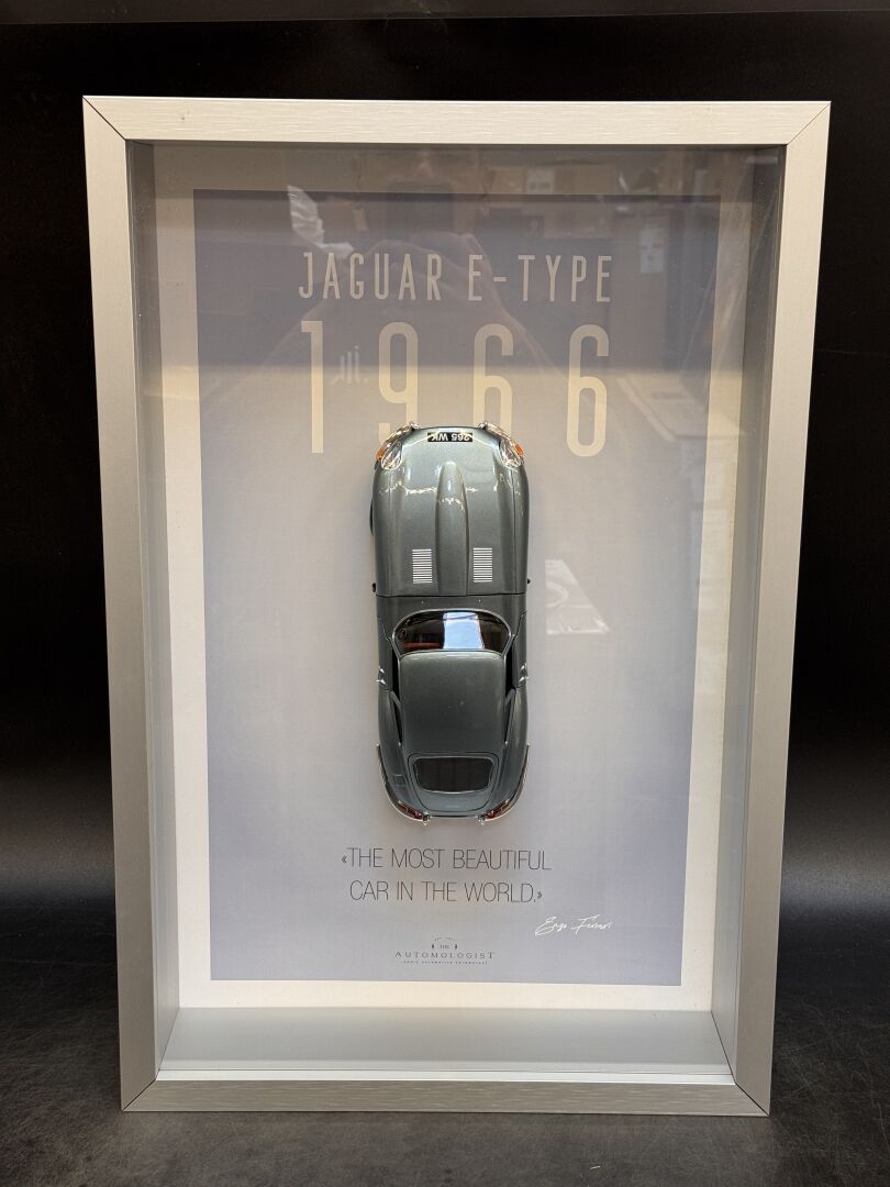 CADRE AUTOMOLOGIST SILVER JAGUAR TYPE E 1966 40X60CM (capot avant légèrement entrouvert EXPEDITION POSSIBLE (ce lot chez vous en France métropolitaine pour 30,64€) Lot issu de colis non réclamés : état de fonctionnement non garanti.