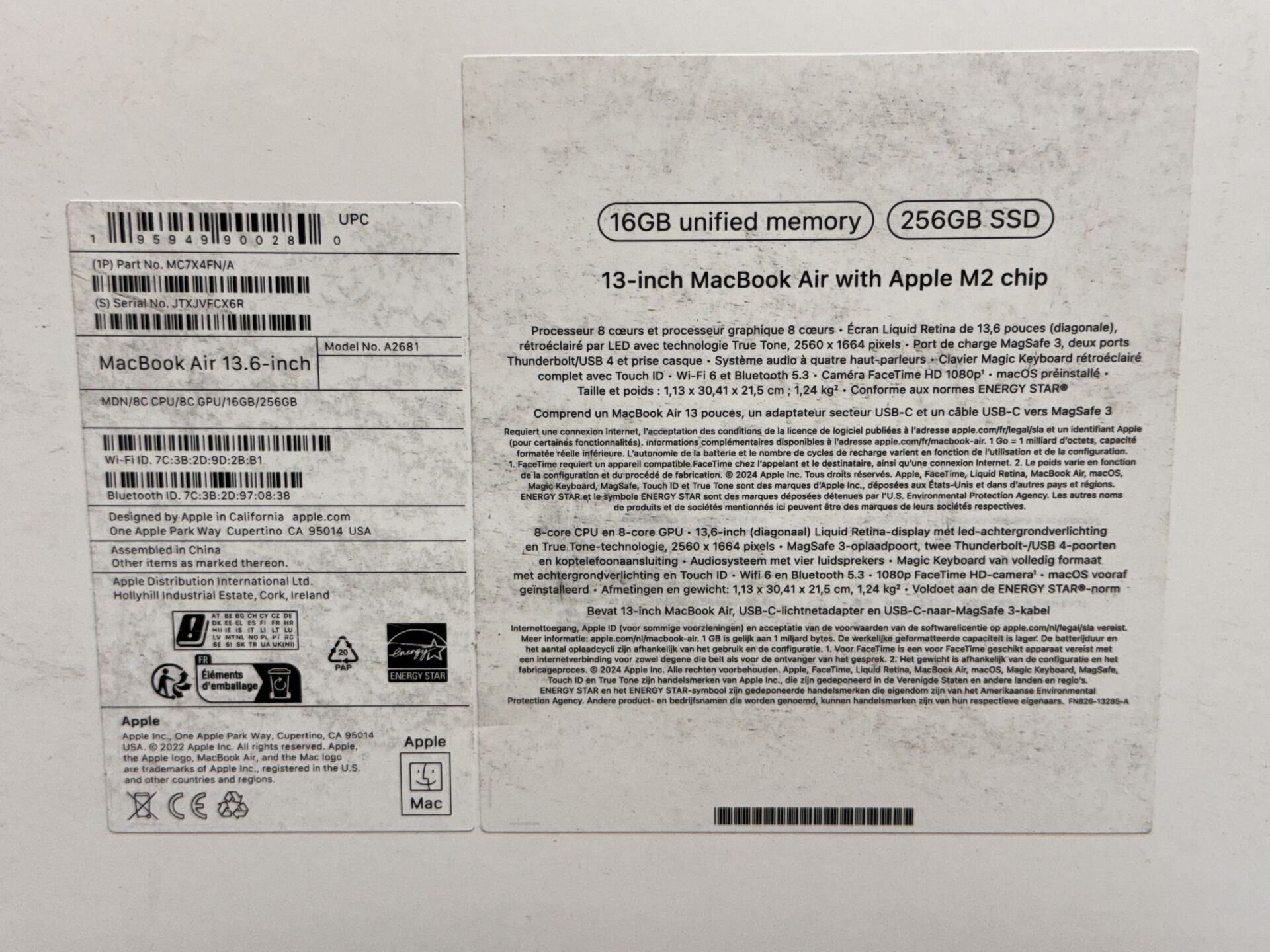 APPLE MACBOOK AIR 13,6" 16 / 256GB A2681 MC7X4FN/A SN JTXJVFCX6R 195949900280 (avec scellés) EXPEDITION POSSIBLE (ce lot chez vous en France métropolitaine pour 27,45€) Lot issu de colis non réclamés : état de fonctionnement non garanti.
