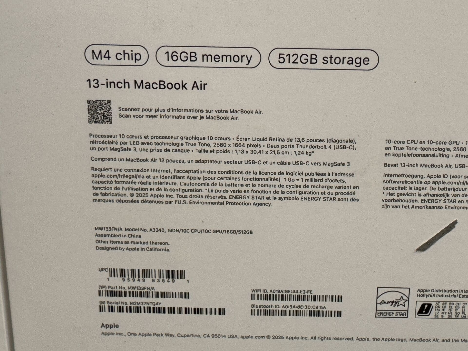 APPLE MACBOOK AIR M4 16 / 512GB A3240 MW133FN/A SN M2M37NTQ4Y 195949838491 (avec scellés) EXPEDITION POSSIBLE (ce lot chez vous en France métropolitaine pour 27,45€) Lot issu de colis non réclamés : état de fonctionnement non garanti.
