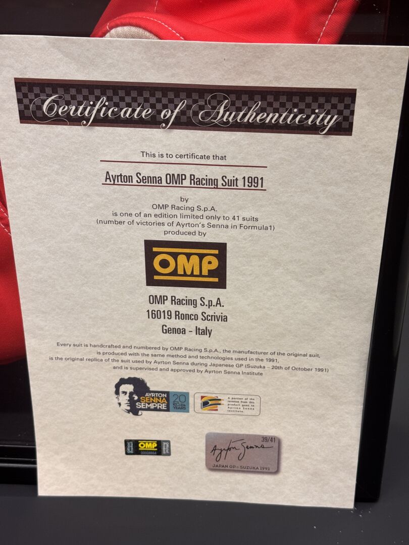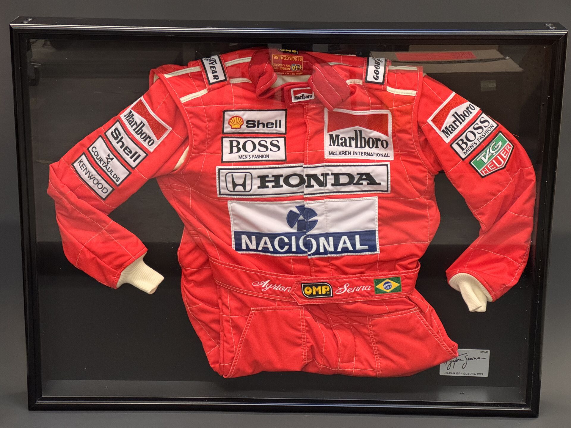 COMBINAISON AYRTON SENNA REPLICA GP SUZUKA 1991 SERIE LIMITEE 41 PIECES / ENCADREE , EDITION NUMEROTEE LIMITEE A 41 EXEMPLAIRES AVEC CERTIFICAT D'AUTHENTICITE (cadre 103x78x10cm) / ON JOINT LEGO ICONS MC LAREN MP4/4 & AYRTON SENNA 10330 (expédition sur devis) Lot issu de colis non réclamés : état de fonctionnement non garanti.