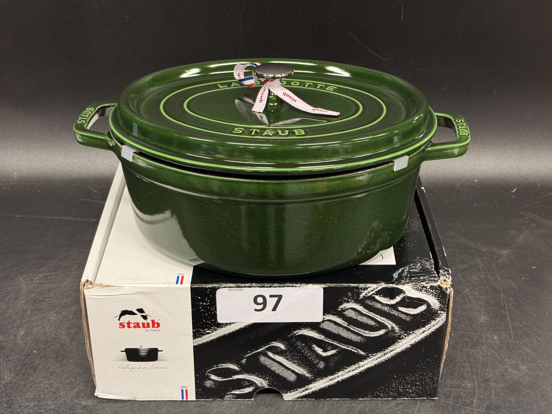 COCOTTE STAUB OVALE 31CM BASILIC EXPEDITION POSSIBLE (ce lot chez vous en France métropolitaine pour 37,90€) Lot issu de colis non réclamés : état de fonctionnement non garanti.