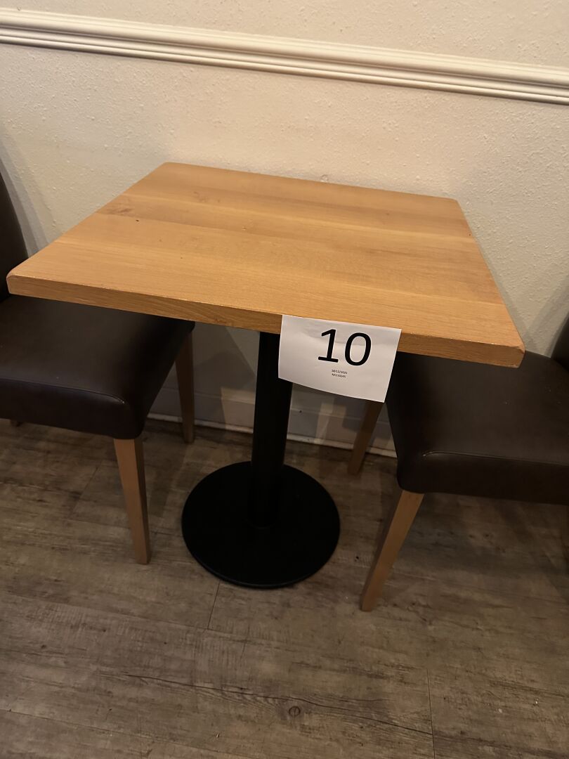 7 tables 2 couverts mélaminé façon bois piètement métal noir, 65x65cm