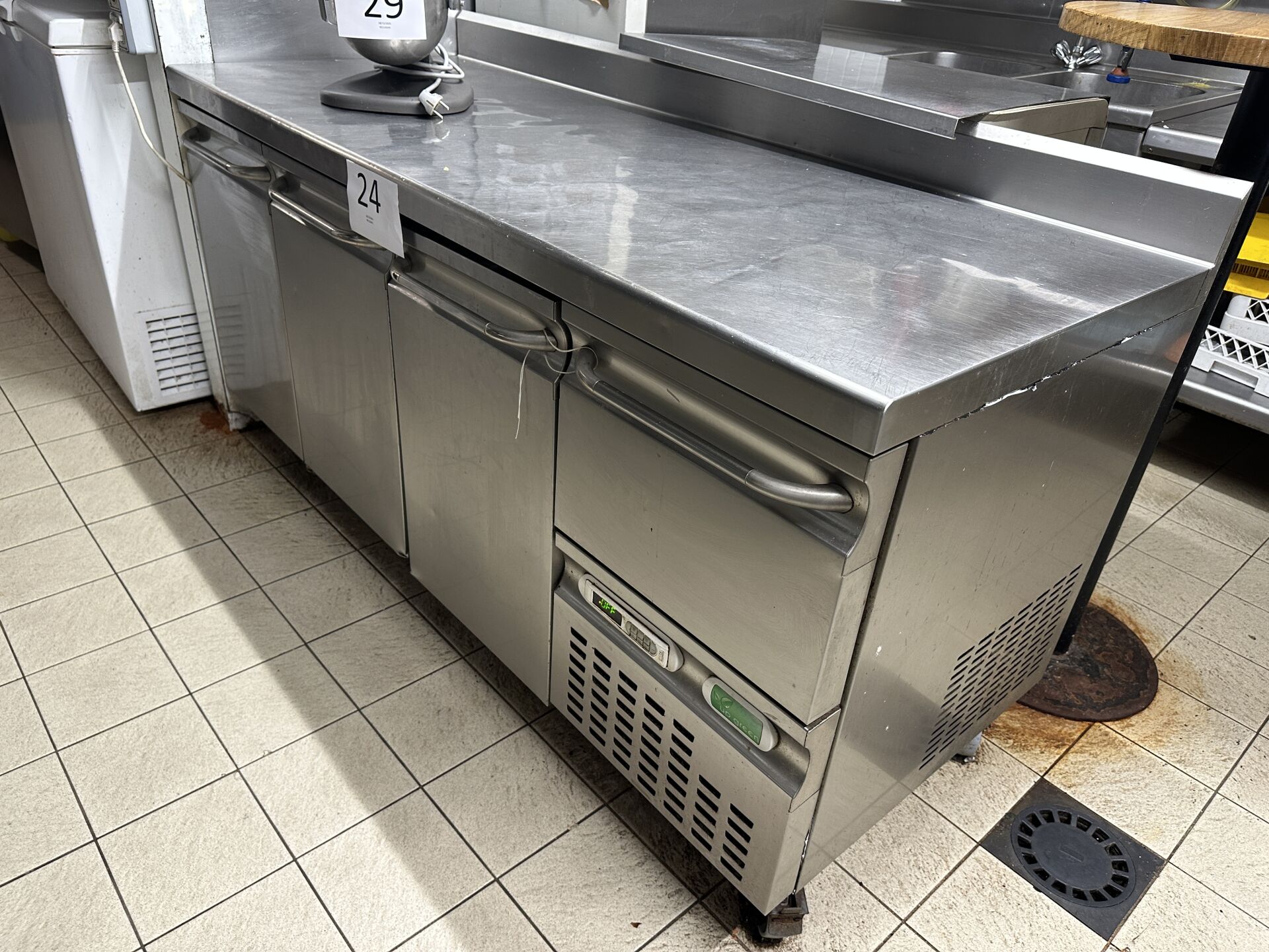 1 tour réfrigéré positif inox UP GREEN, 3 portes et 1 tiroir, moteur logé à droite (état moyen), de 2011 (176 x 72 cm) (1 charnière de porte absente)