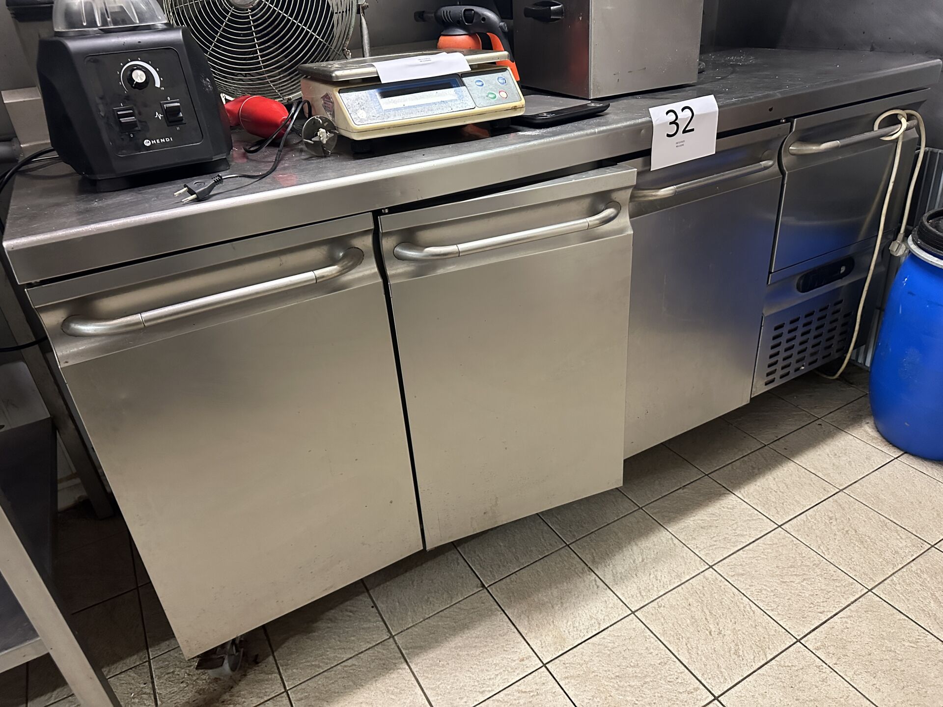 1 tour réfrigéré positif inox à dosseret LINEA 4, 3 portes et 1 tiroir, moteur logé à droite, 175x70cm (en panne), de 2009