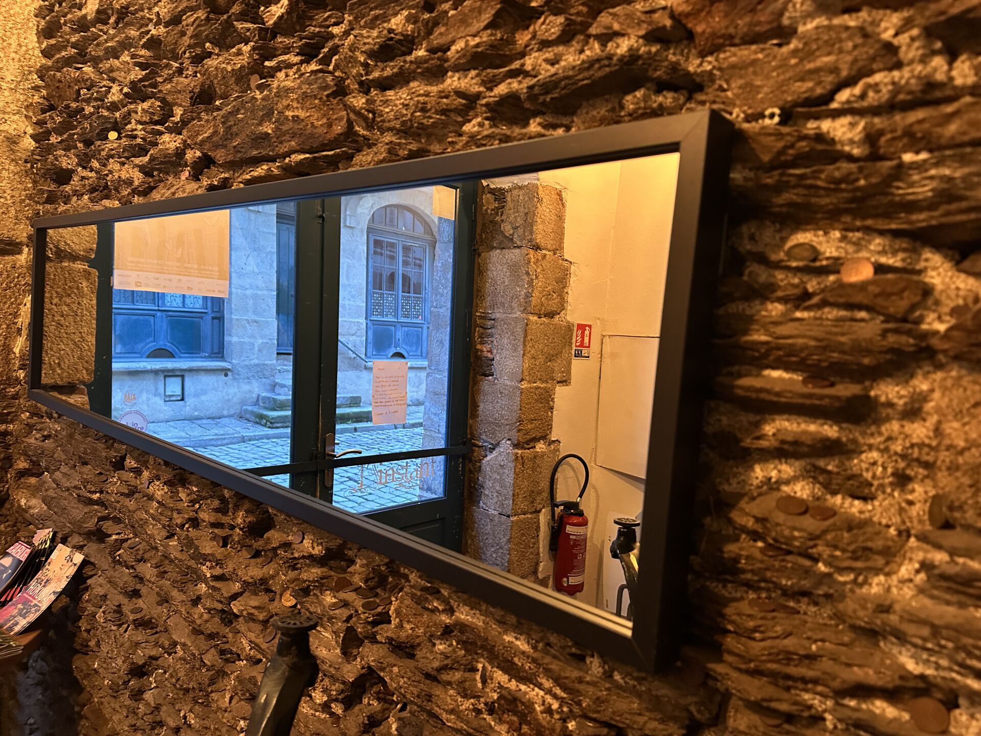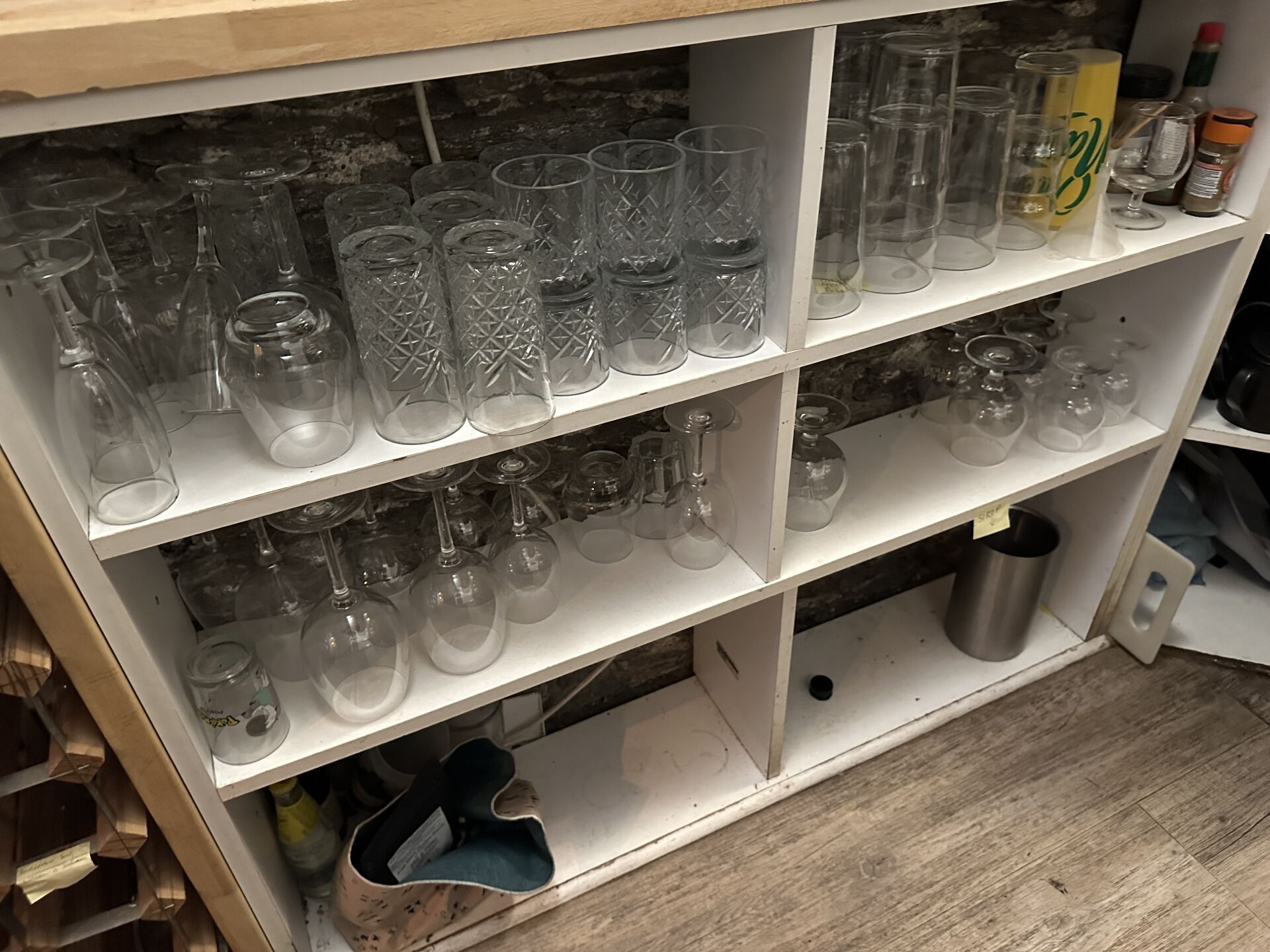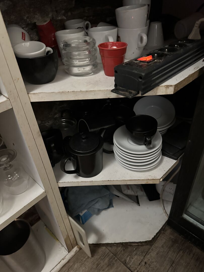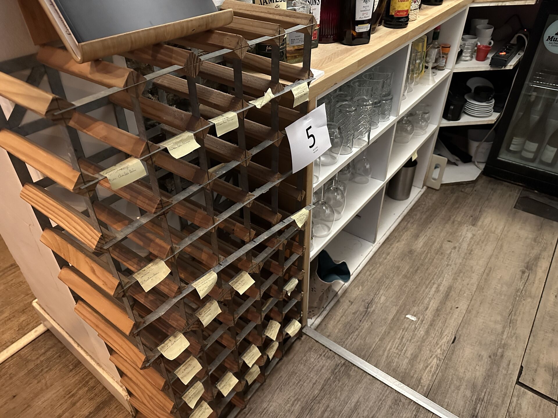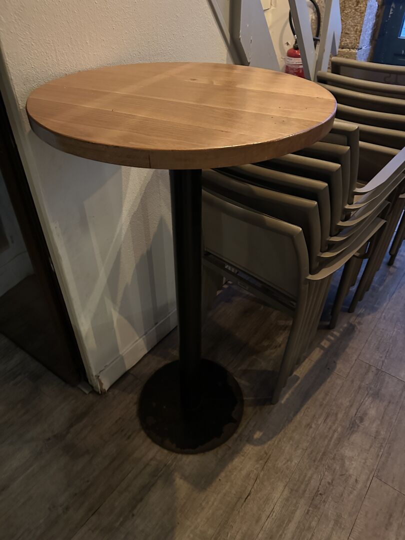 2 mange-debout mélaminé façon bois piètement métal noir, diamètre 60cm 1 miroir rectangulaire cadre métal 160 x 40 cm 1 meuble à bouteilles métal et bois 50 x 22 x 100 cm on y joint 1 petit lot de verrerie et tasses de café 1 mange debout mélaminé façon bois piètement métal, diamètre 60cm