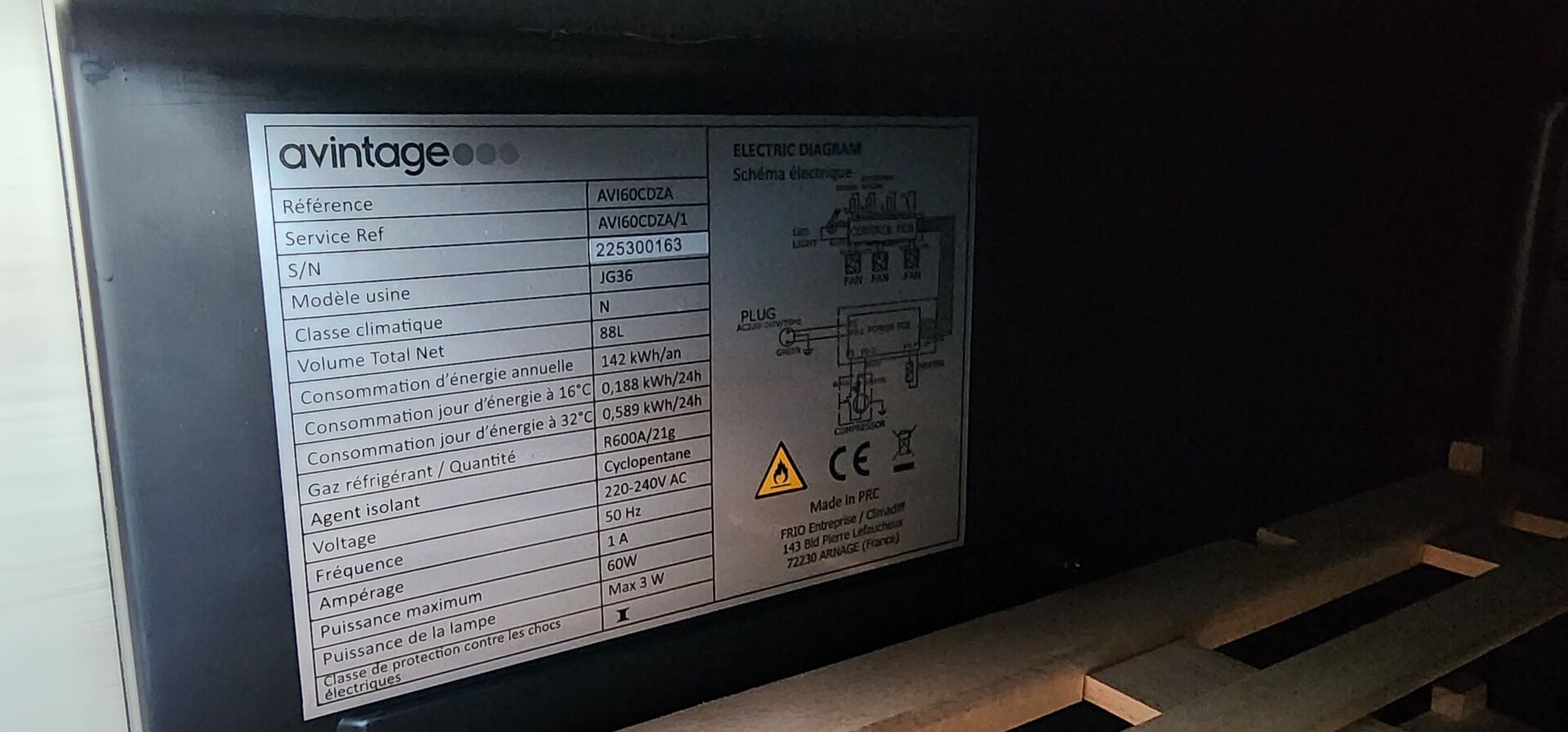 1 cave à vin encastrable AVINTAGE AVI60CD2A , 88 litres, porte vitrée Frais de mise à disposition 10 € TTC