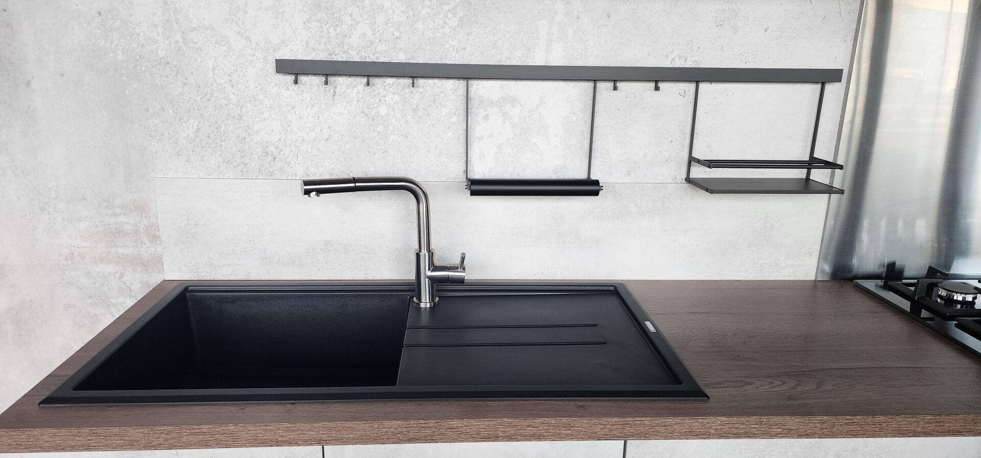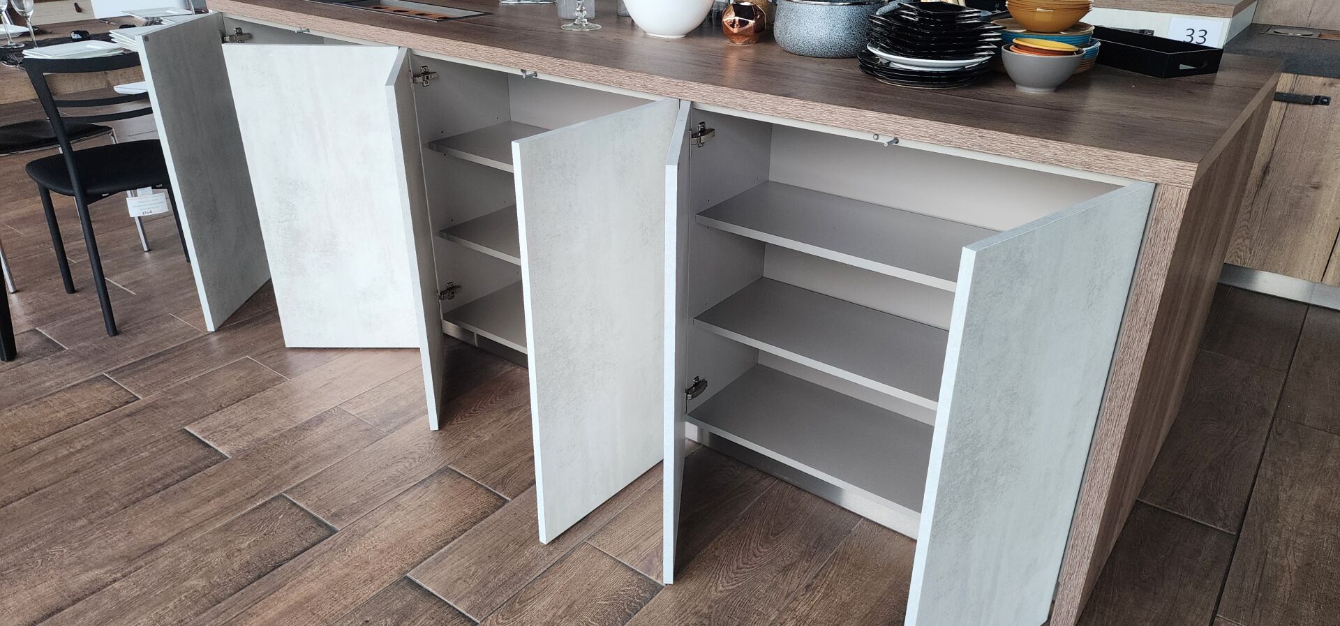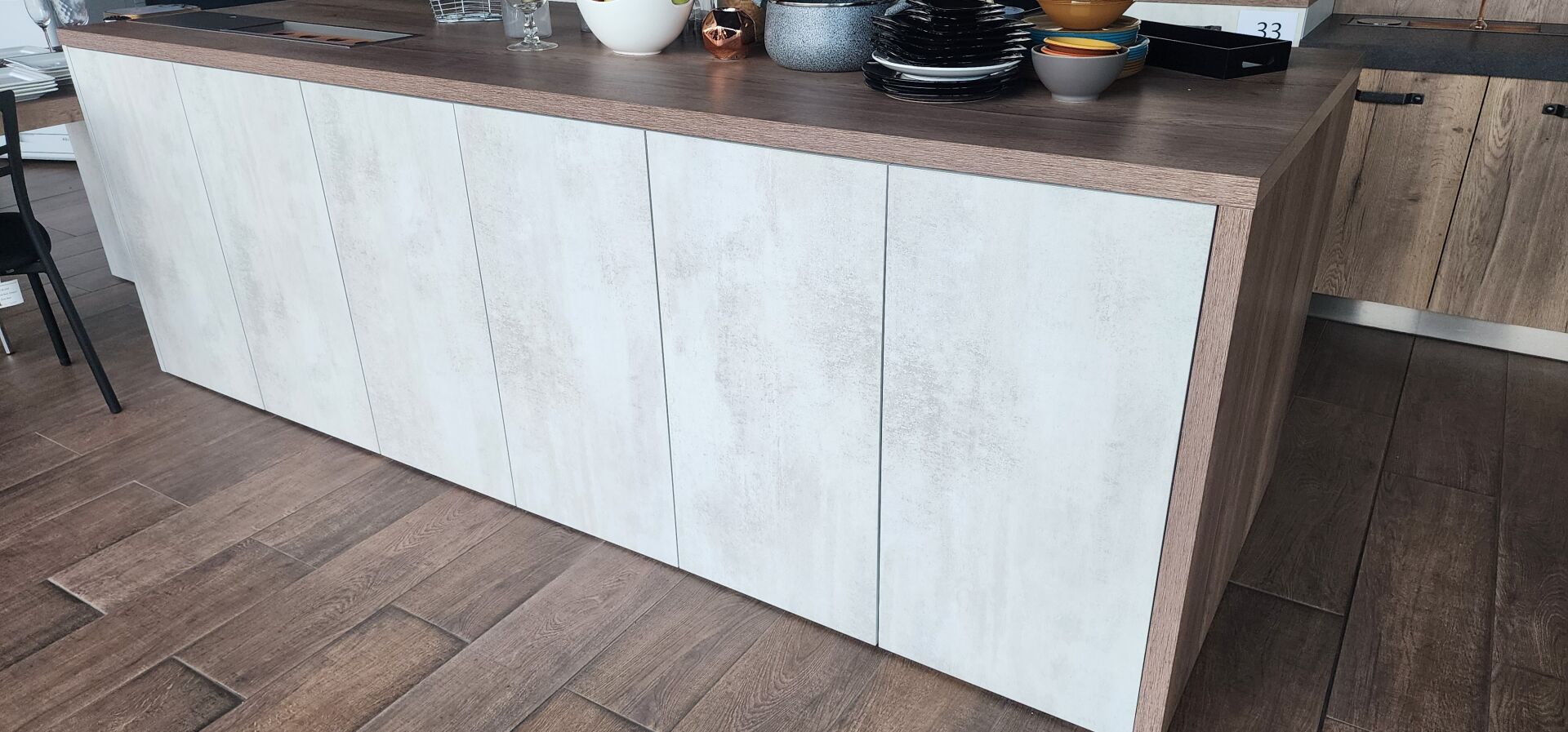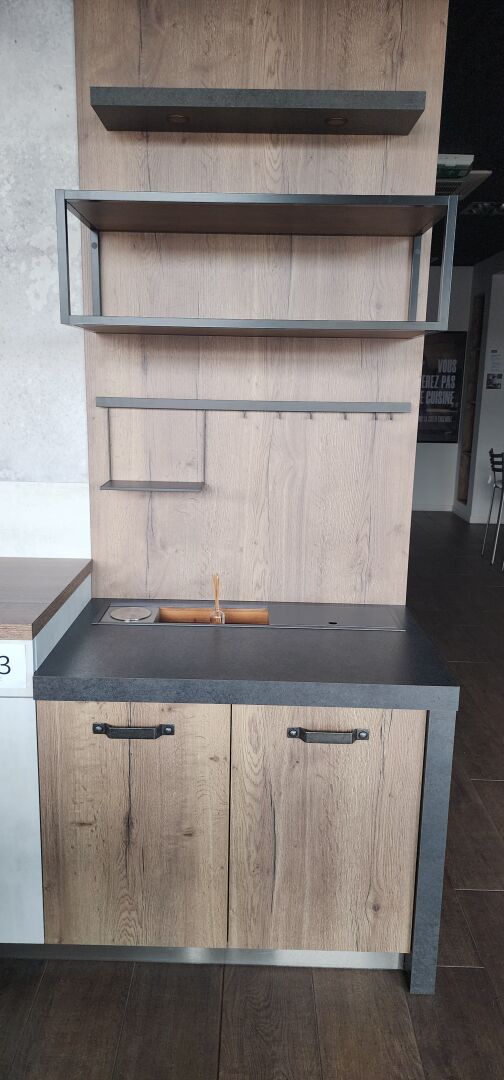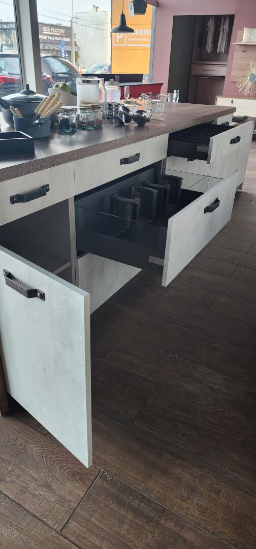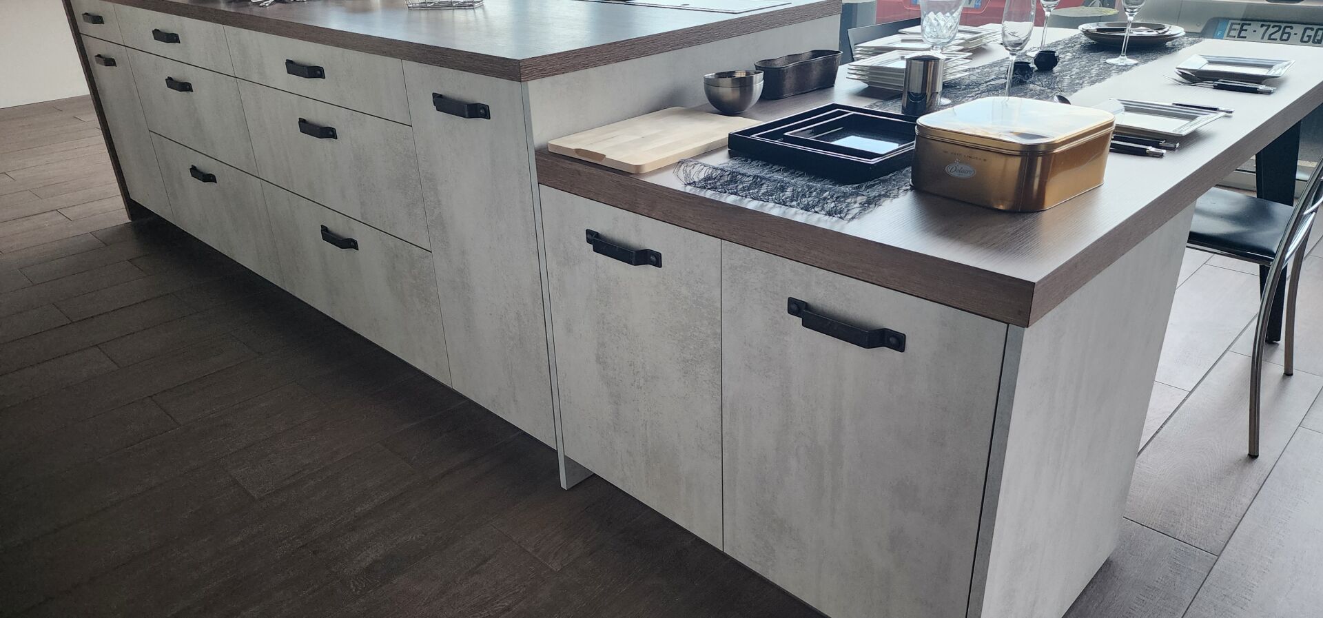 1 cuisine d'exposition H6 HARMONIE pose droite façades mélaminé blanc béton avec ilot central dimensions ilot : 276 x 98 cm, table associée 177 x 92 cm, partie murale 380 x 61 cm, ensemble caissons/étagères murales : 140 x 37 x 72 cm, 1 étagère métal et bois 90 x 37 x 29 cm, avec matériels électroménagers encastrés comprenant : 1 lave-vaisselle encastré ELECTROLUX CONFORT LIFT EEC67310L 1 évier BRADANO composite noir avec mitigeur douchette 1 hotte SIEMENS HBD KNBH V avec crédence On y joint 2 chaises dépareillées : 1 CANNUBIA métal noir opaque 1 piètement métal chromé assise simili cuir noir Frais de mise à disposition 50 € TTC