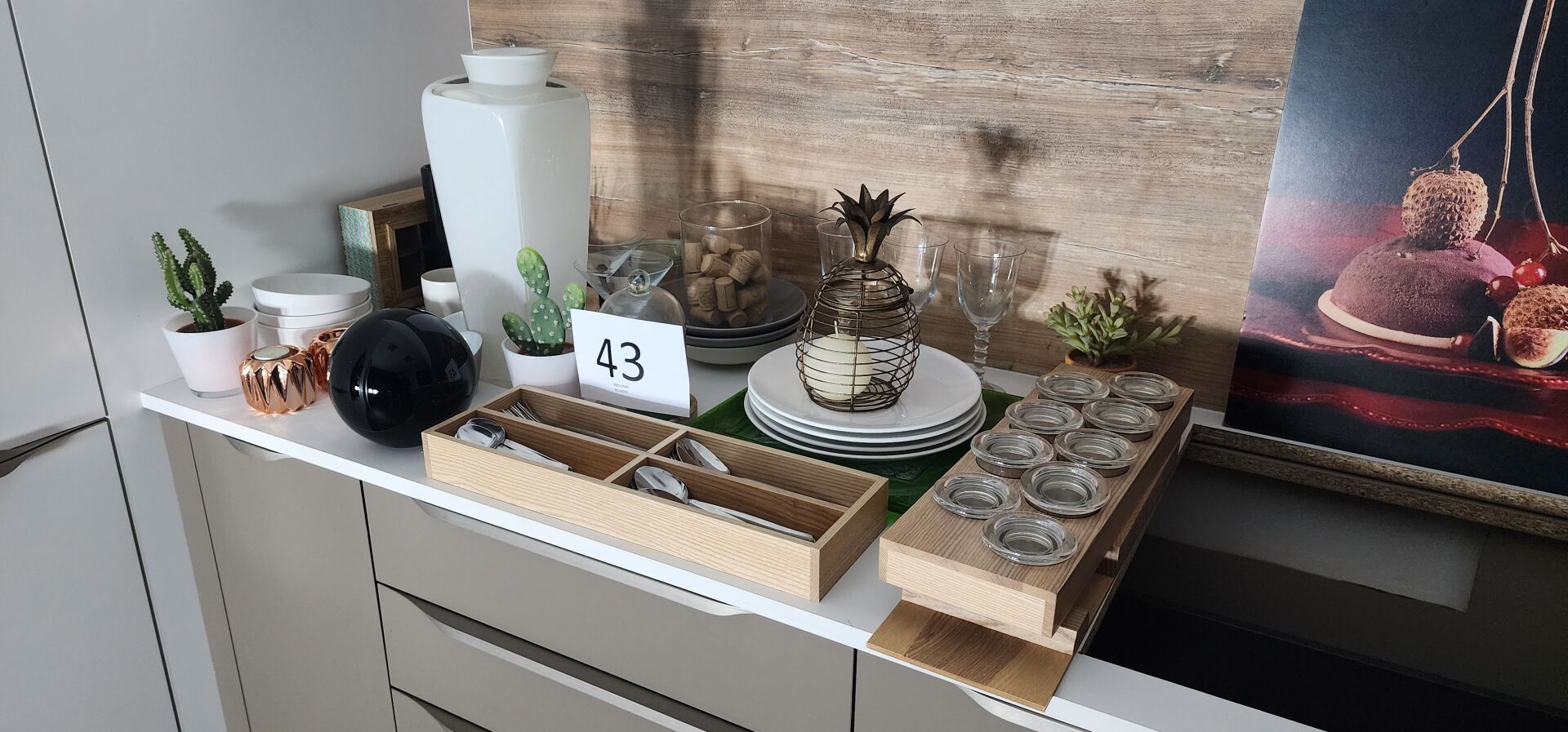 1 lot de décoration et accessoires de cuisine (assiettes, couverts, bols, verres, vases, pots à épices, plantes artificielles...) Frais de mise à disposition 10 € TTC