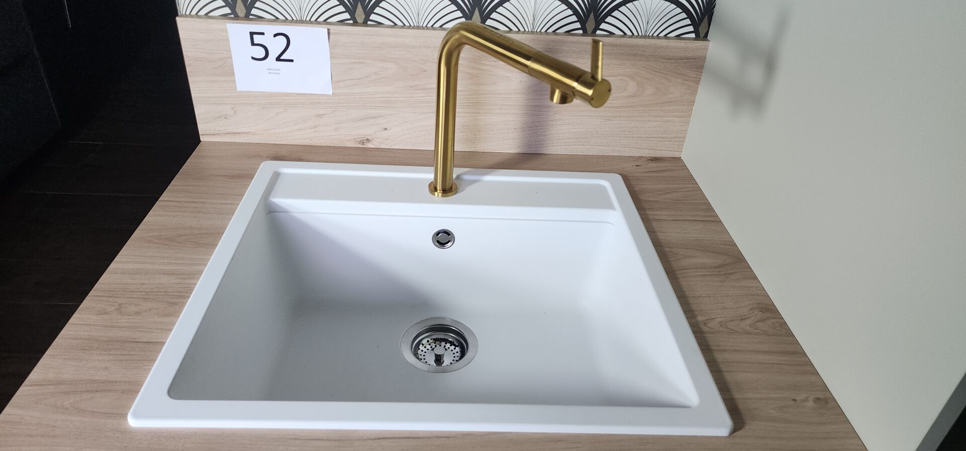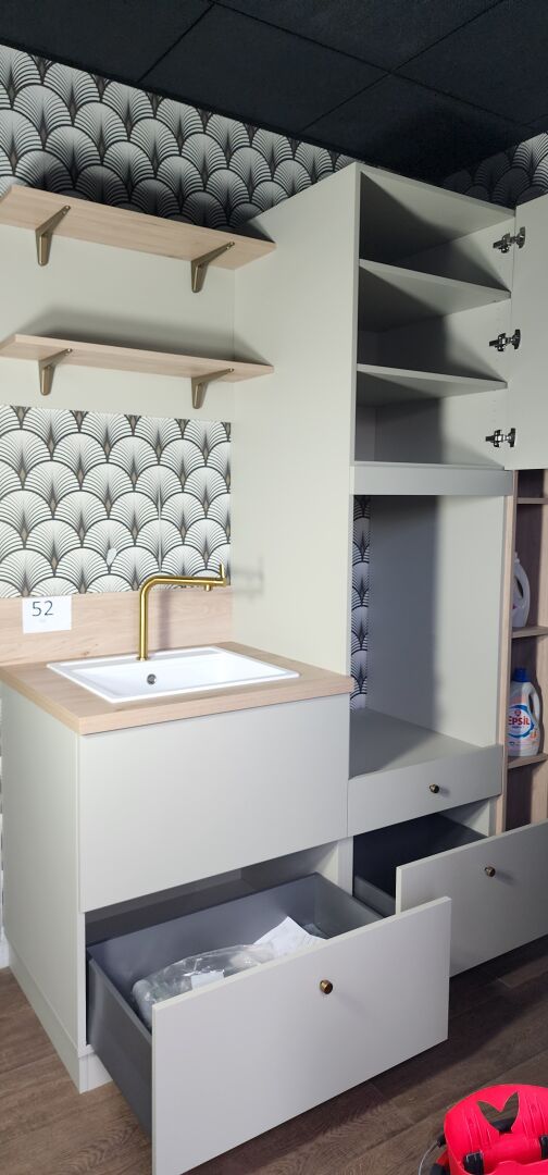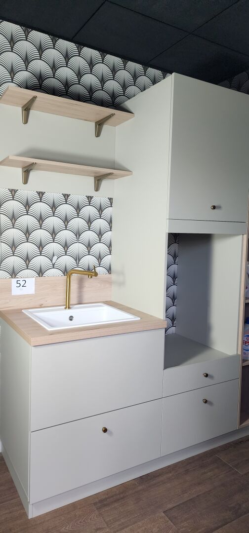 1 aménagement arrière-cuisine comprenant une colonne et un meuble bas en mélaminé vert horizon , plan stratifié façon bois, 1 évier blanc, 1 mitigeur évier doré, 175 x 70 x 234 cm + 2 étagères murales 81 x 25 cm Frais de mise à disposition 30 € TTC