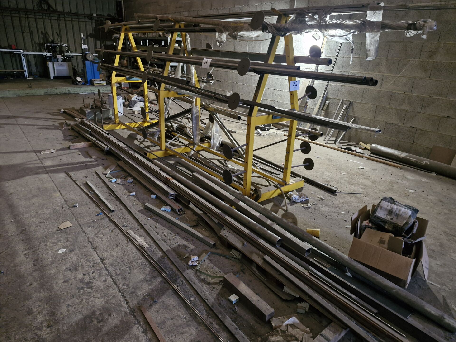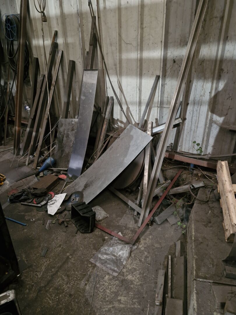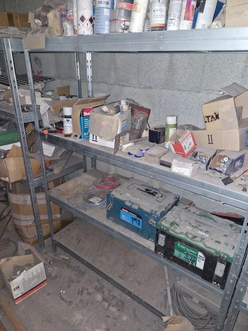 1 rack métal comprenant 2 échelles et 4 lisses fabrication interne , à découper Répartis dans le local : 1 stock de chutes de profils alu, acier et inox