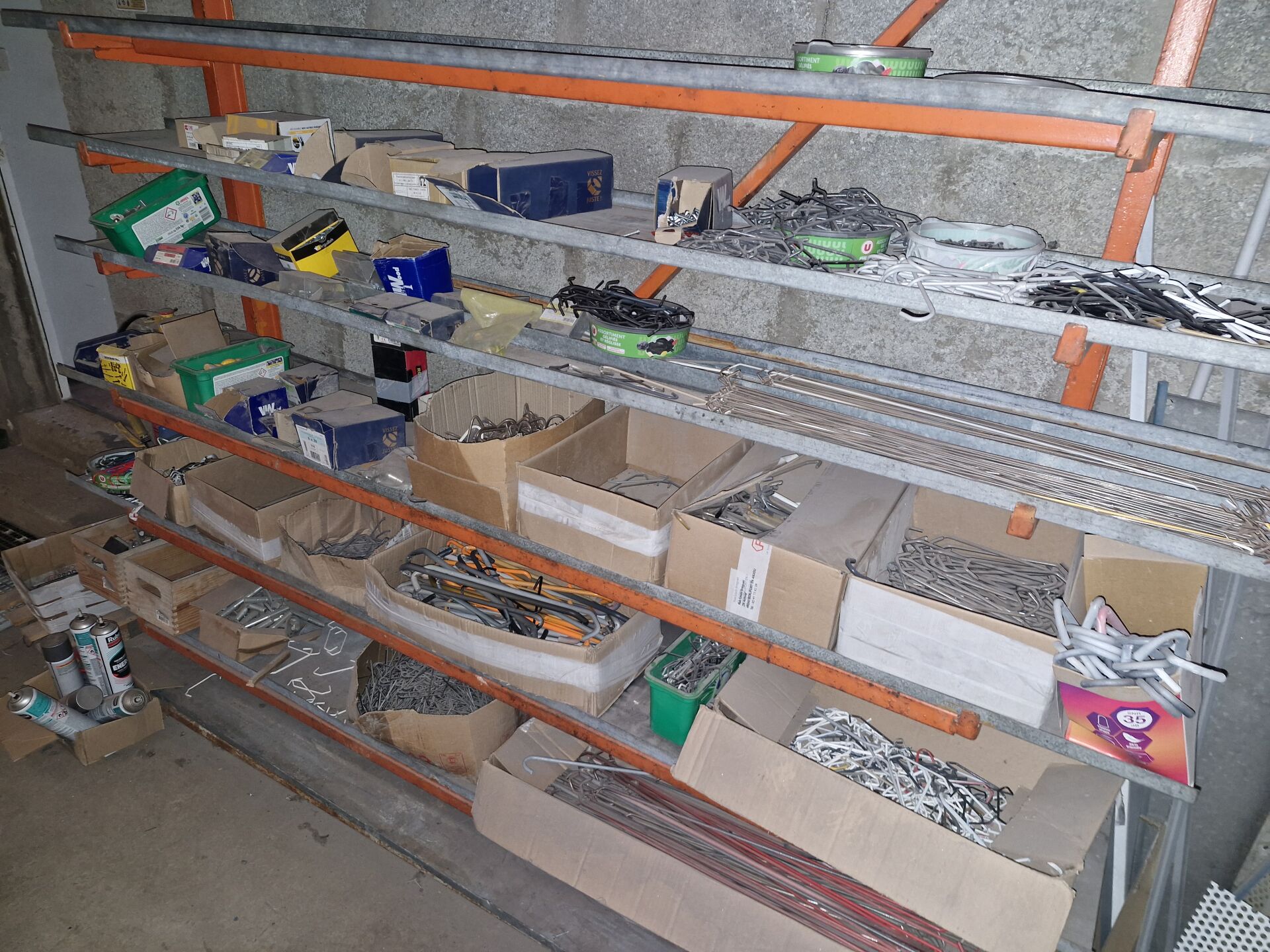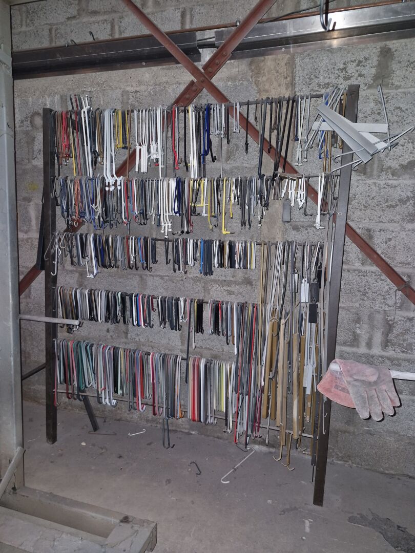4 potences de séchage mobiles métal gris, longueur 4m (x1) et 5 m (x3) hauteur 253 cm larg 150 cm 1 lot de crochets métal + contenu étagères (visserie, etc)