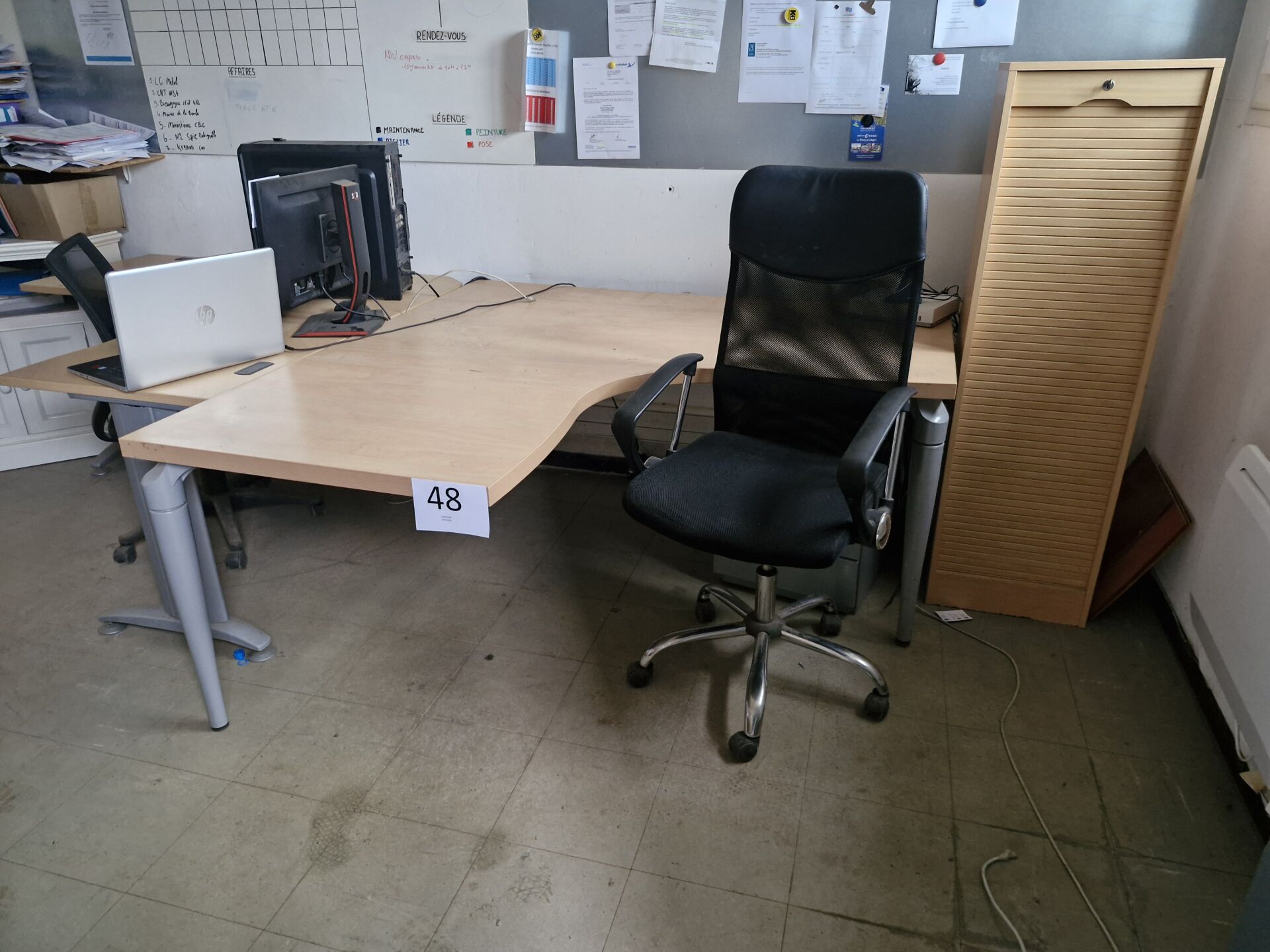2 bureaux d'angle mélaminé façon bois et métal gris 2 fauteuils tournants et roulants filet noir, différents modèles 1 meuble colonne mélaminé façon bois 1 meuble mi-hauteur mélaminé façon bois 2 tiroirs 1 meuble mélaminé façon bois 2 portes en partie basse 1 meuble d'angle mélaminé bois 2 portes en partie basse 1 caisson mobile métal gris 3 tiroirs 1 chaise visiteur tissu bleu 1 caisson mobile métal gris et mélaminé façon bois 3 tiroirs