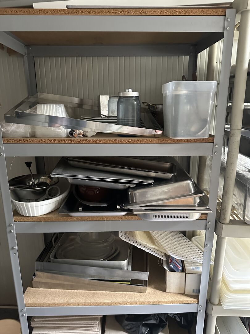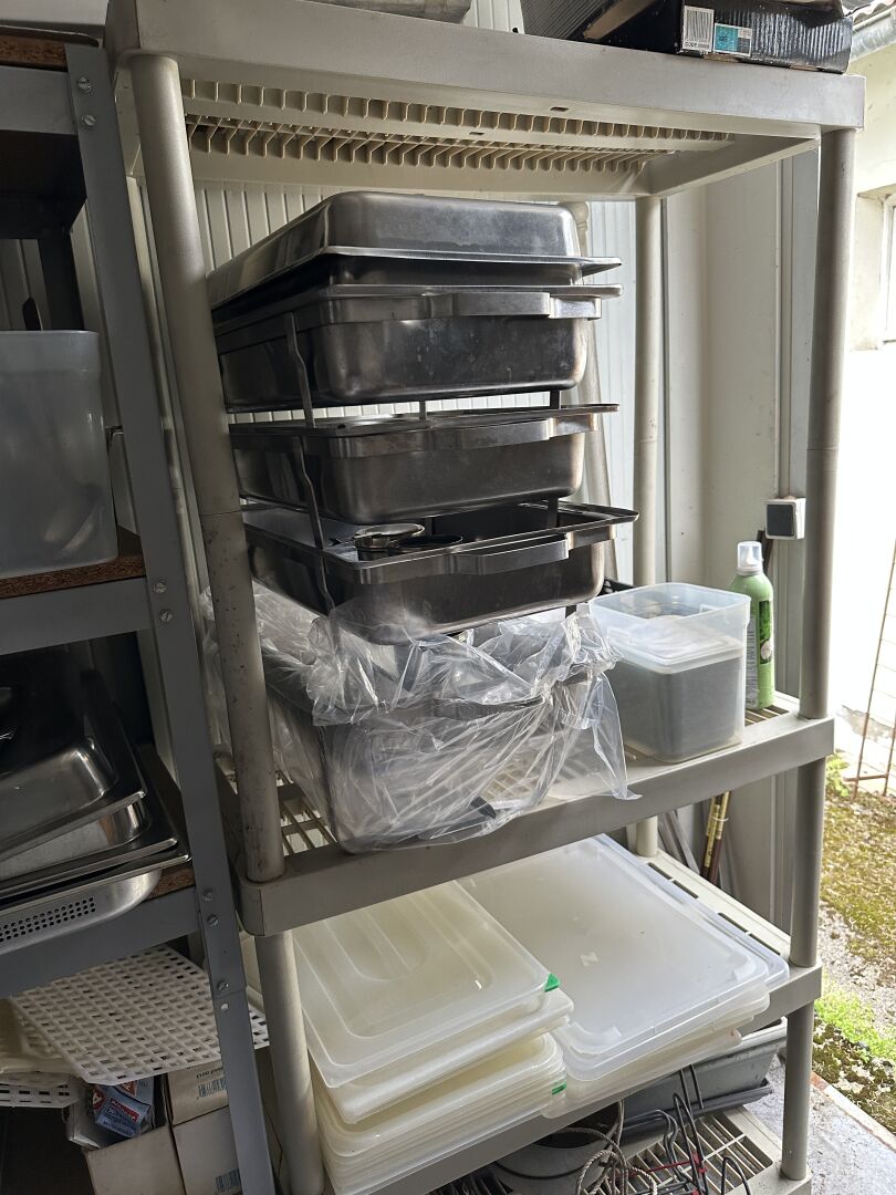 Contenu du bungalow : 1 four METRO 1 étagère plastique 1 étagère métal 2 tables rondes 6 tables rectangulaires 4 couverts 12 tables 2 couverts 4 chaises bois 21 chaises bistrot 1 aspirateur traineau ROWENTA