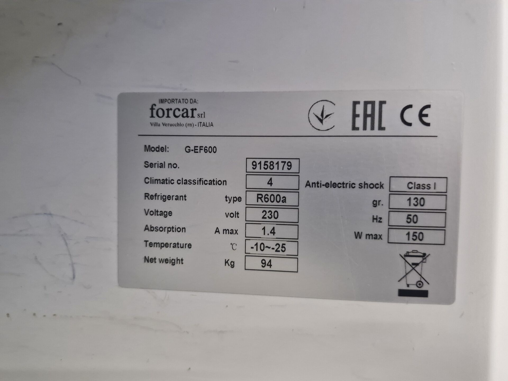 1 armoire réfrigérée négative FORCAR G-EF600 No de série 9158179 de 2019 77 x 70 x 188 cm