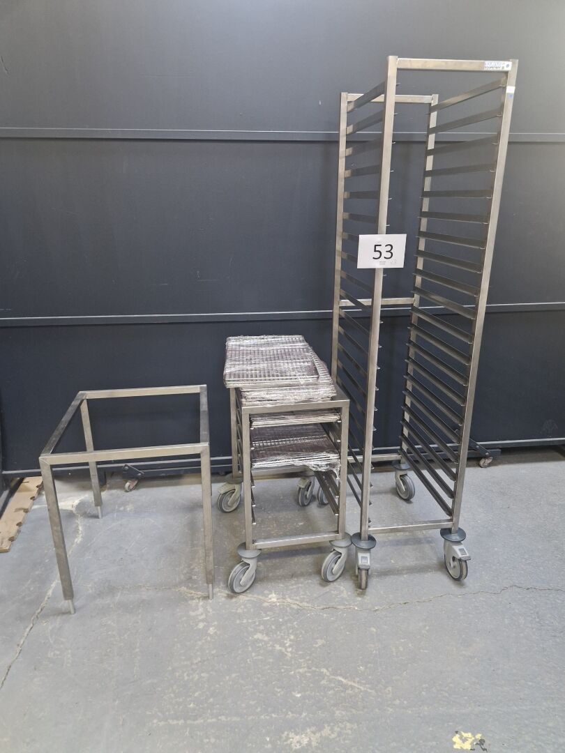 1 échelle mobile inox 20 niveaux TOURNUS EQUIPEMENT, 58x38.5cm 1 demi échelle inox 6 niveaux SOFINOR 38x57 cm 1 lot d'environ 24 grilles 32 x 54 cm 1 bâti inox 60 x 54 x 60 cm