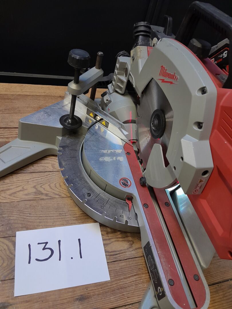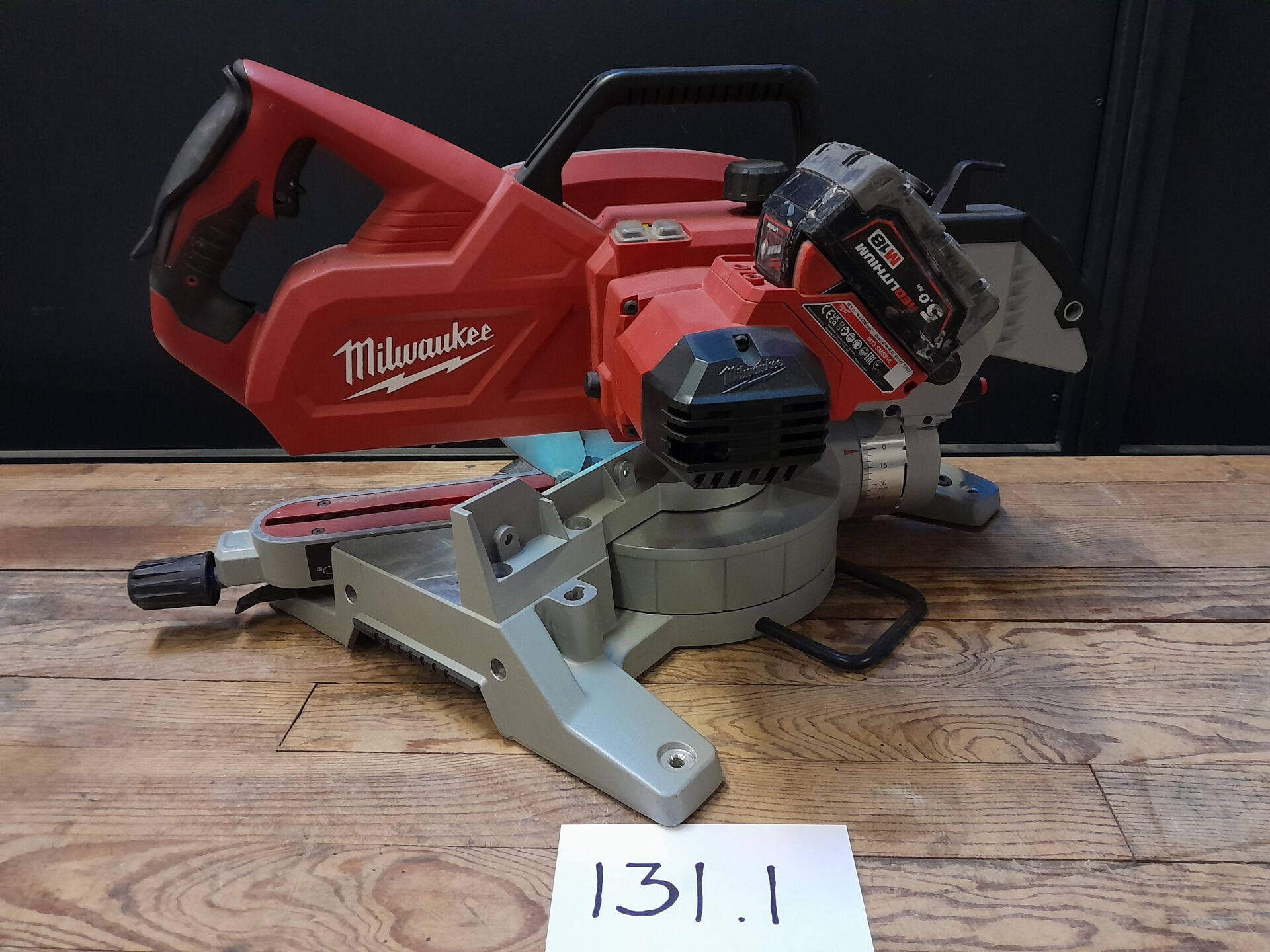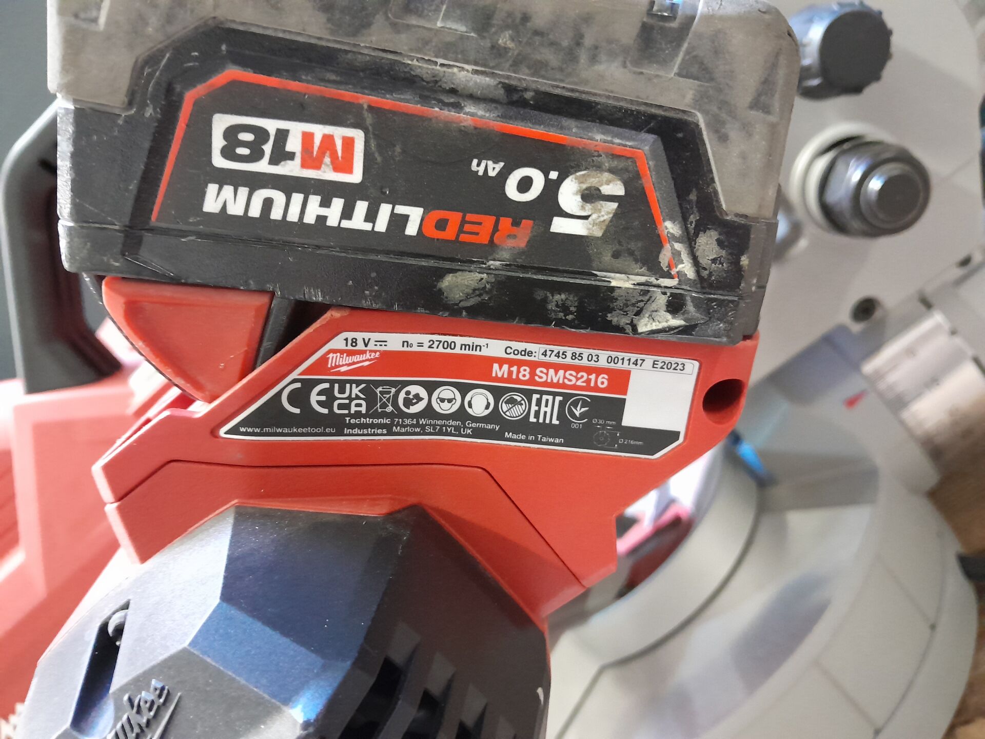 1 scie à onglet radiale autonome modèle SMS216 avec 1 batterie modèle M 18 5 B le tous de marque MILWAUKEE sans chargeur n/s 14955328 - 15012385