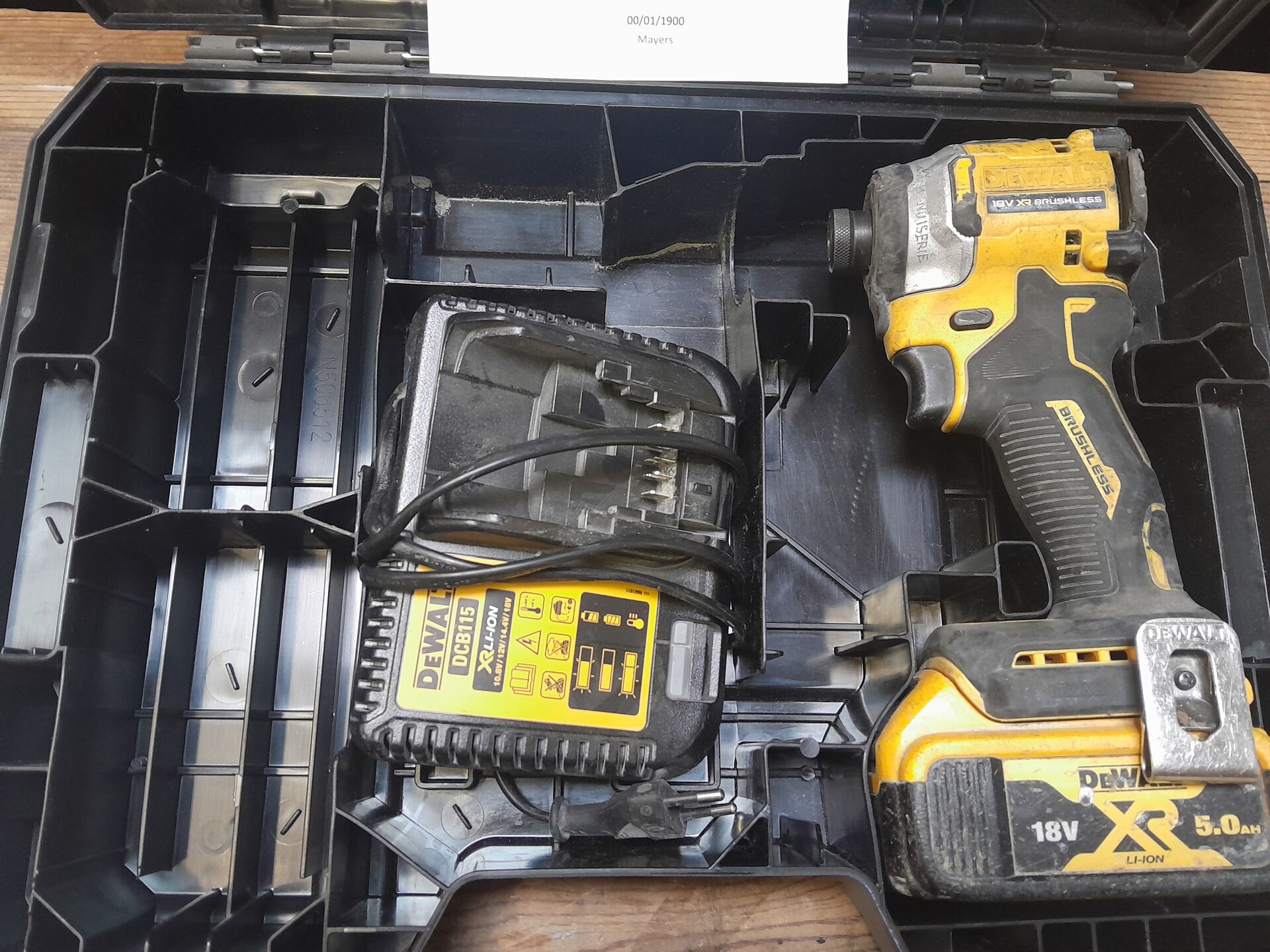 1 perceuse-visseuse à choc autonome modèle DCF850 de marque DEWALT en coffret avec 1 chargeur modèle DCB115 ainsi qu'une batterie modèle XR LI-ION 18 V 5 AH, N/S illisible ou non renseigné