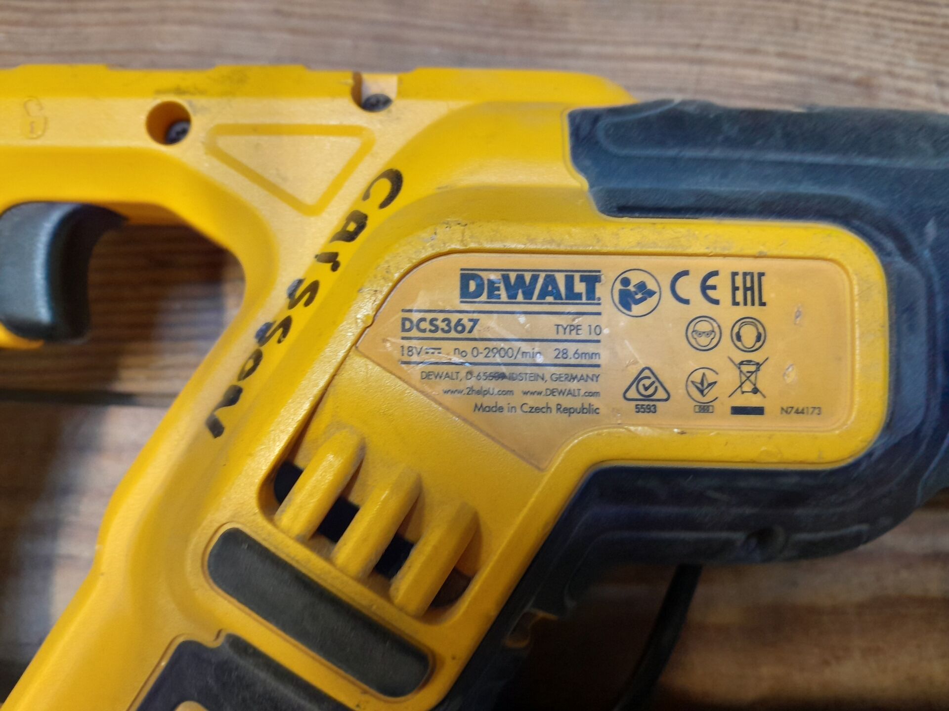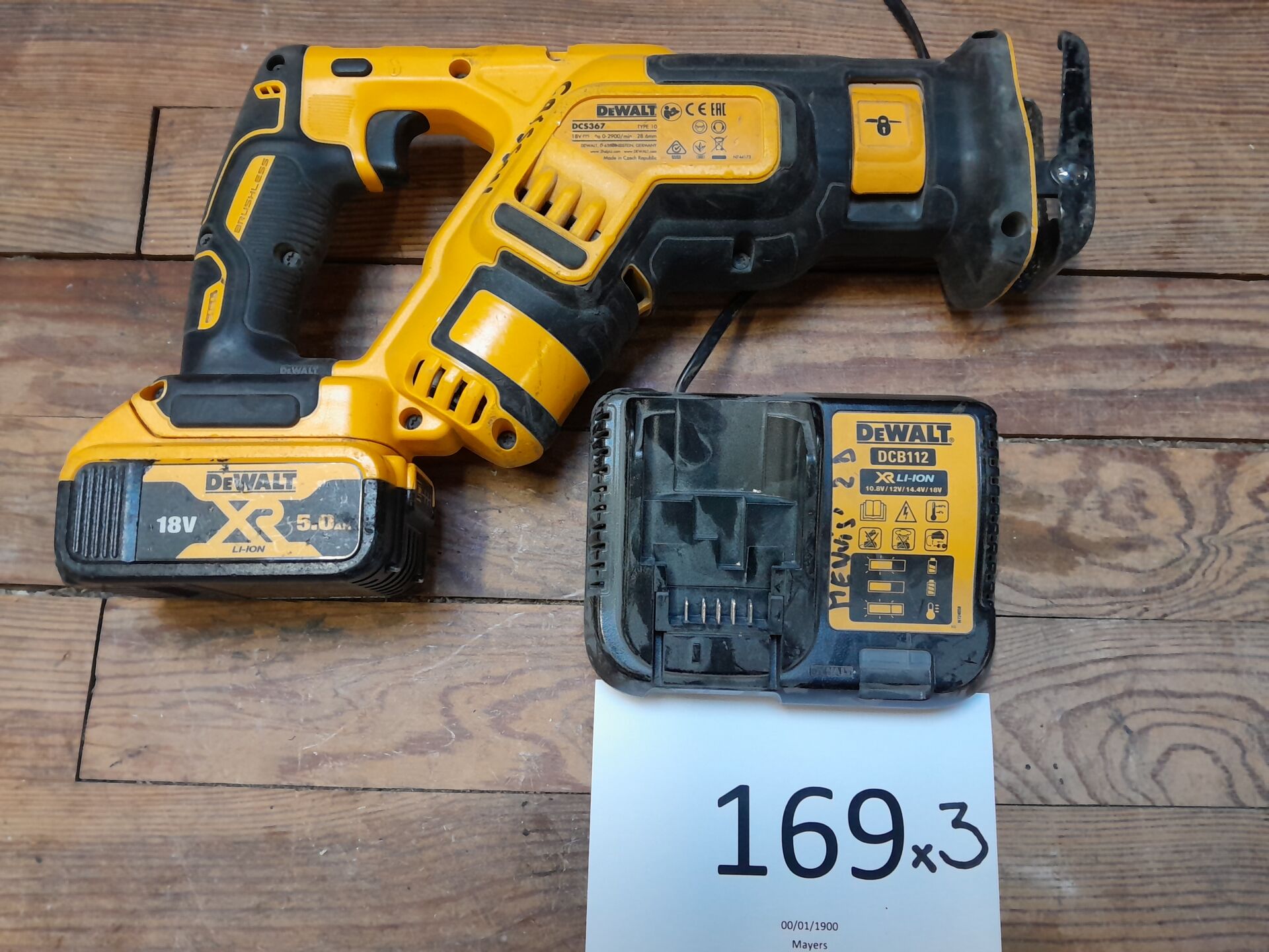 1 scie sabre compact autonome modèle DCS367 de marque DEWALT avec 1 chargeur modèle DCB115 ainsi qu' une batterie modèle XR LI-ION 18 V 5 AH, N/S N744173 - N724058 - N636466