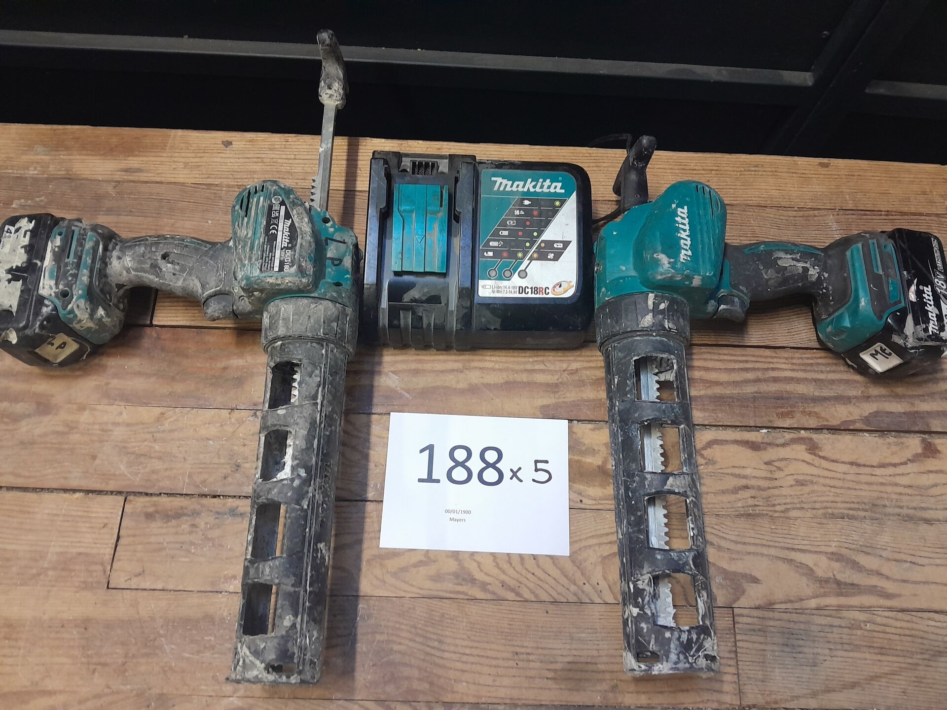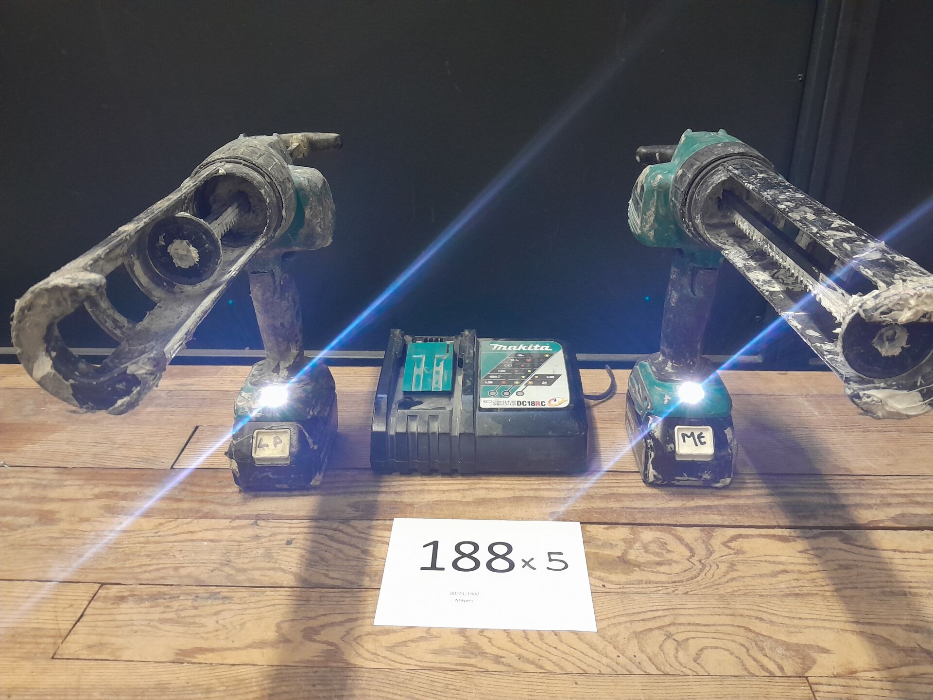 1 ensemble comprenant 2 pistolets à mastic mod DCG180 , 2 batteries mod BL1840 18 V 4 AH ainsi qu'1 chargeur mod DC18RC le tout de marque MAKITA, N/S 604695 - 612807 - 1113618