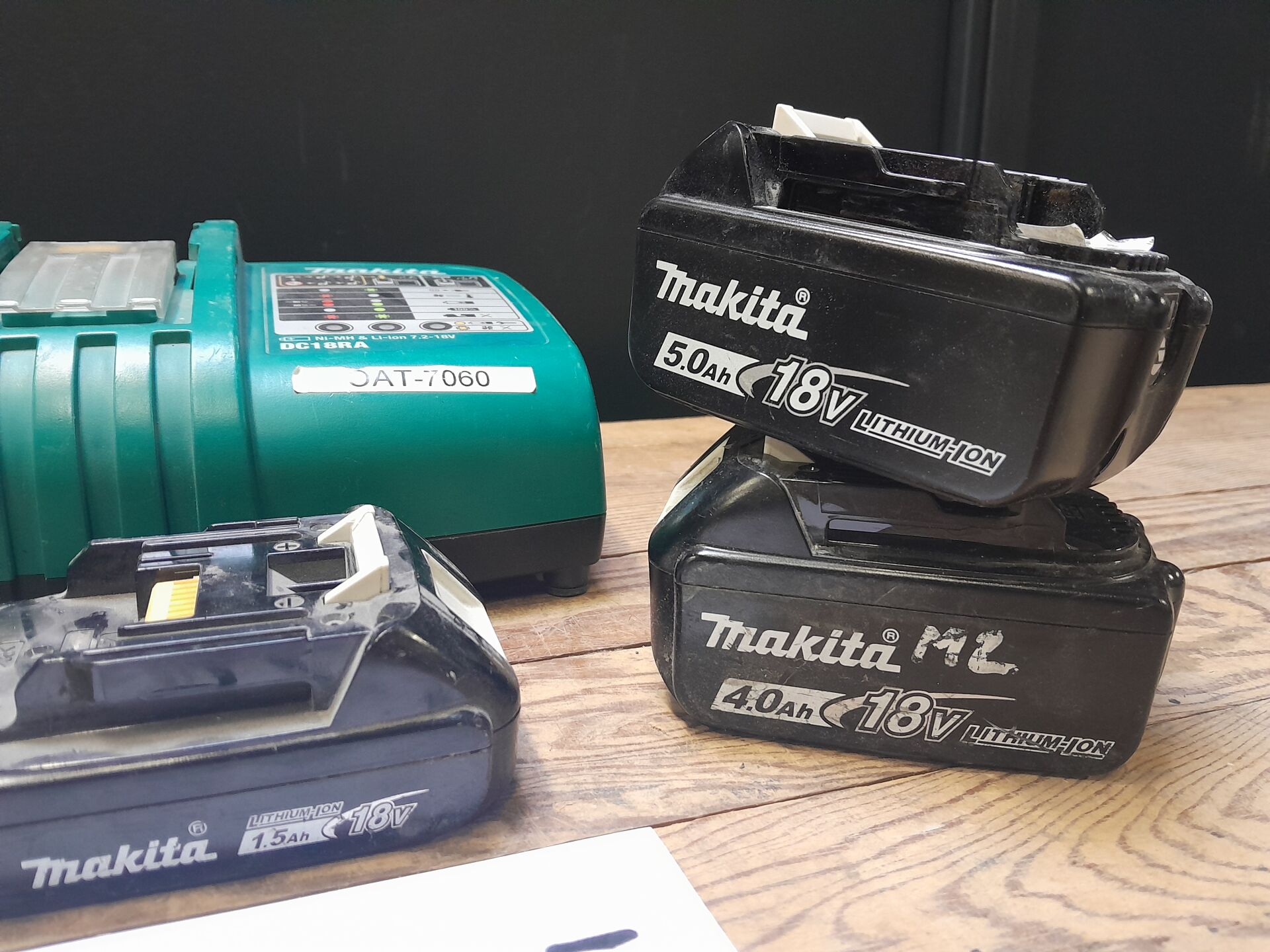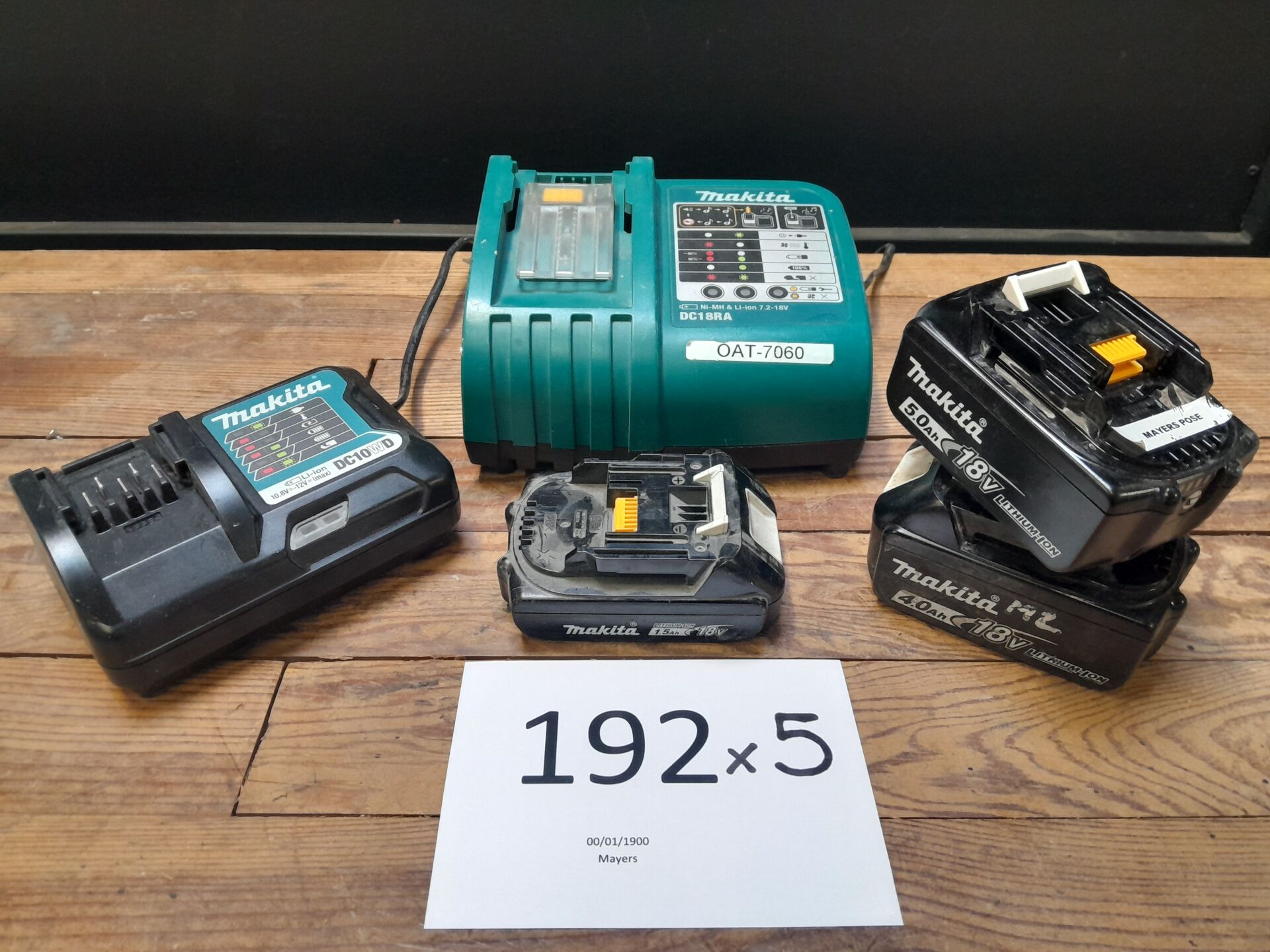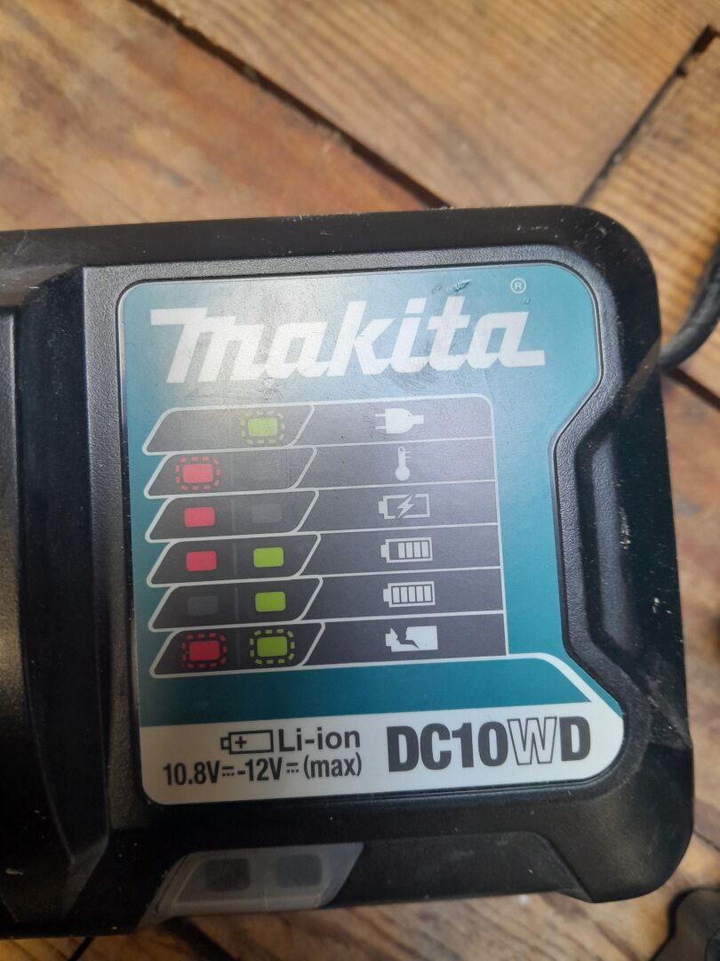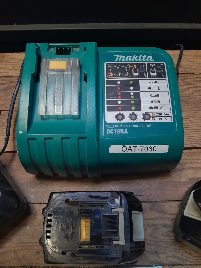 1 ensemble comprenant 1 chargeur mod DC10WD , 1 chargeur mod DC18RA , 3 batteries : 1 mod BL1840B 18 V 4 AH, 1 mod BL1850B 18 V 5 AH, 1 mod BL1815N 18 V 1.5 AH le tout de marque MAKITA, n/s illisible ou non renseigné