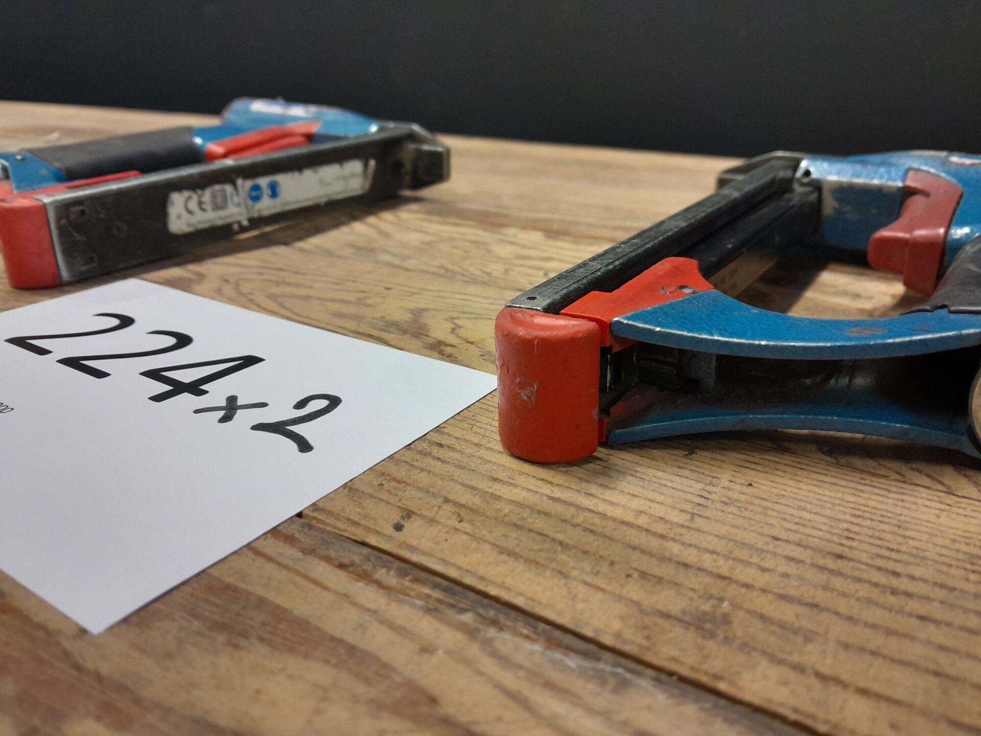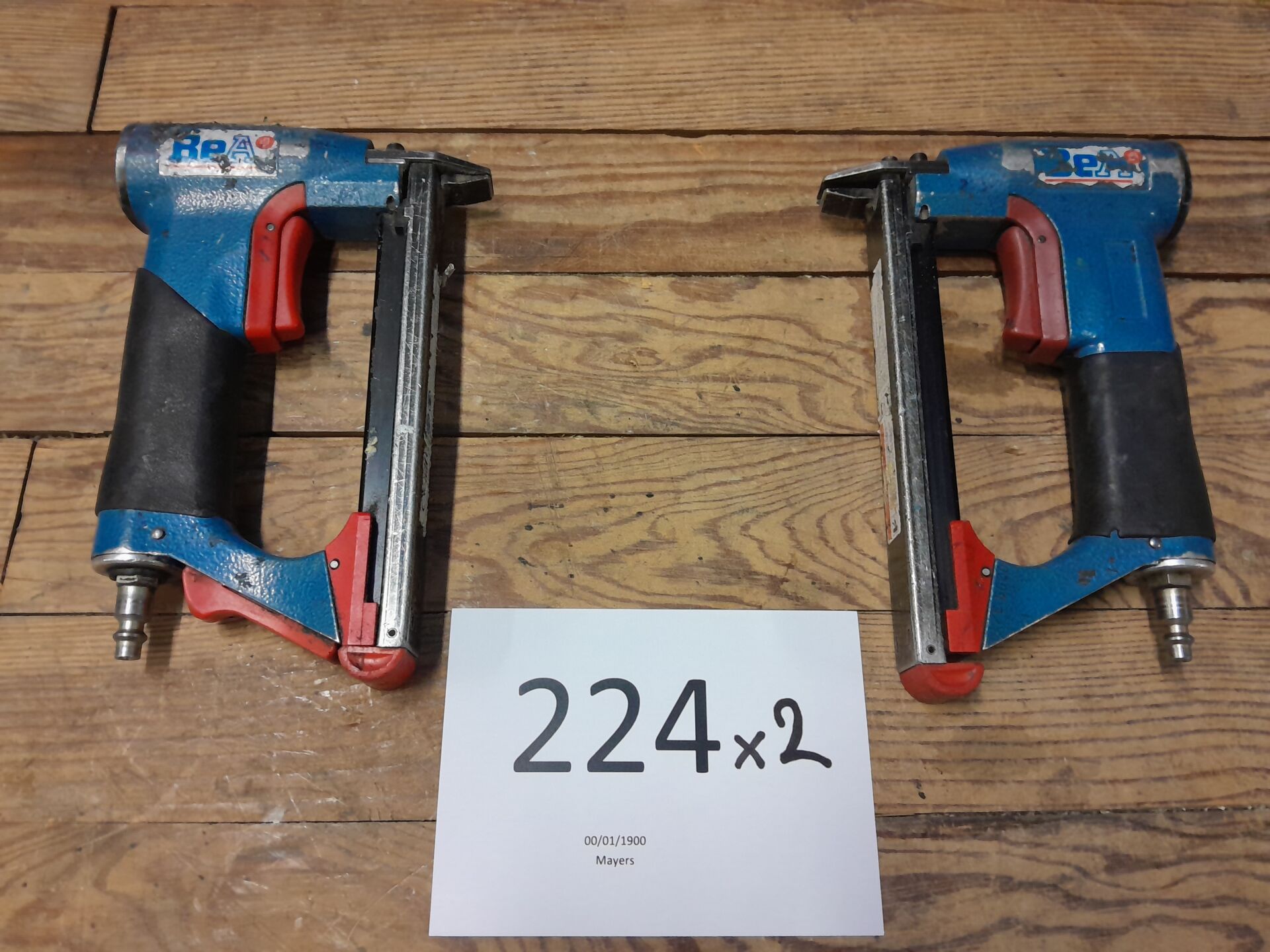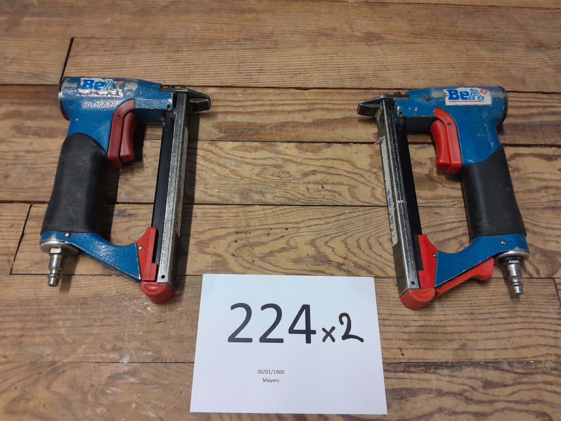 2 agrafeuses pneumatiques bec court modèle 95/16-425 de marque BEA Dimensions : 22 x 3,5 x 14 cm, (manque une gachette sur l'une des agrafeuses) n/s 0299 3/19 - 2141 9/27