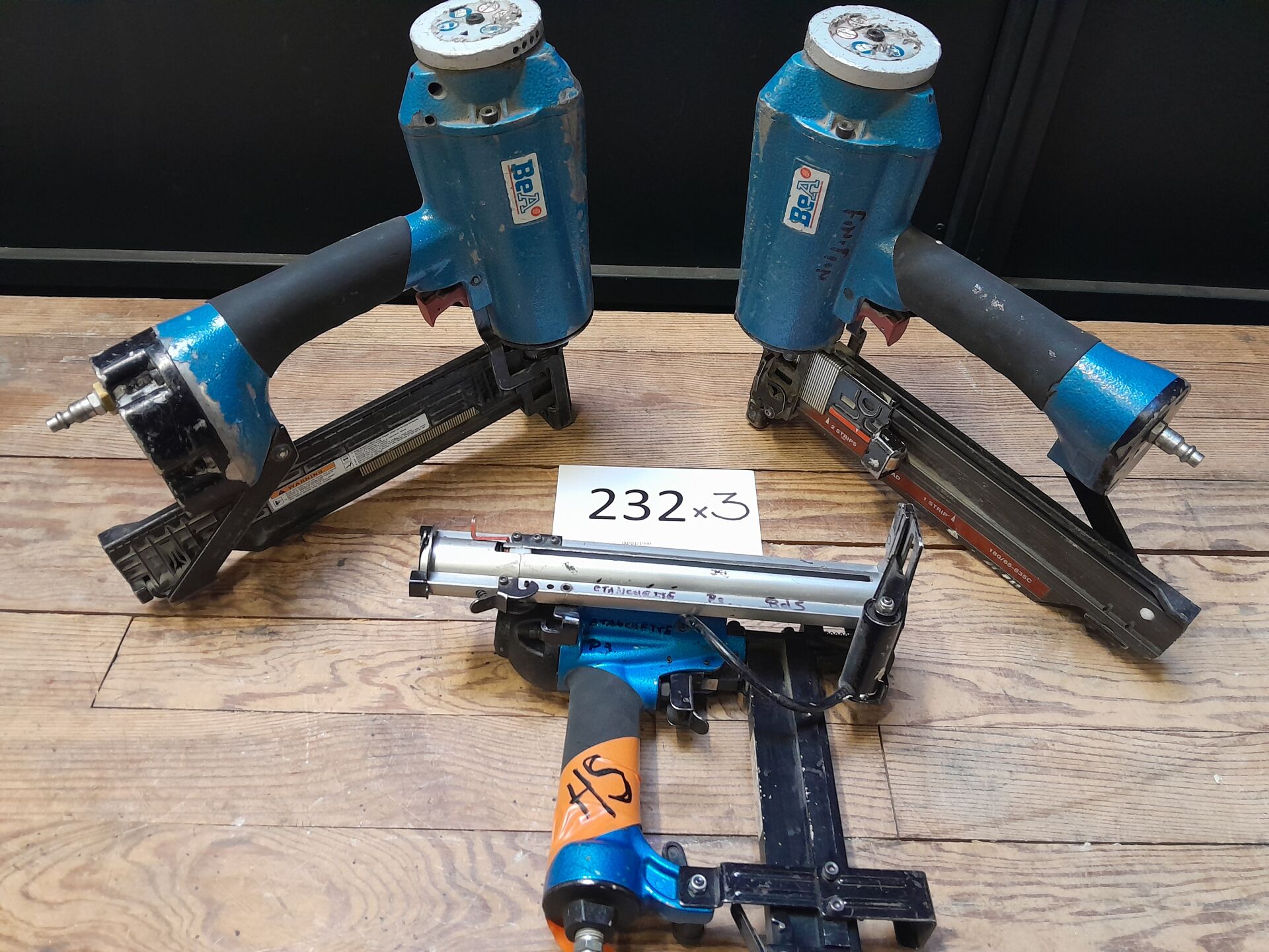 1 ensemble comprenant : 2 agrafeuses pneumatiques modèle 180/65-835C de marque BEA ainsi qu' 1 agrafeuse pneumatique pour agrafes à dos large modèle 246/130-944 dimensions 400 X 396 X 132 mm avec l'annotation HS le tous de marque BEA