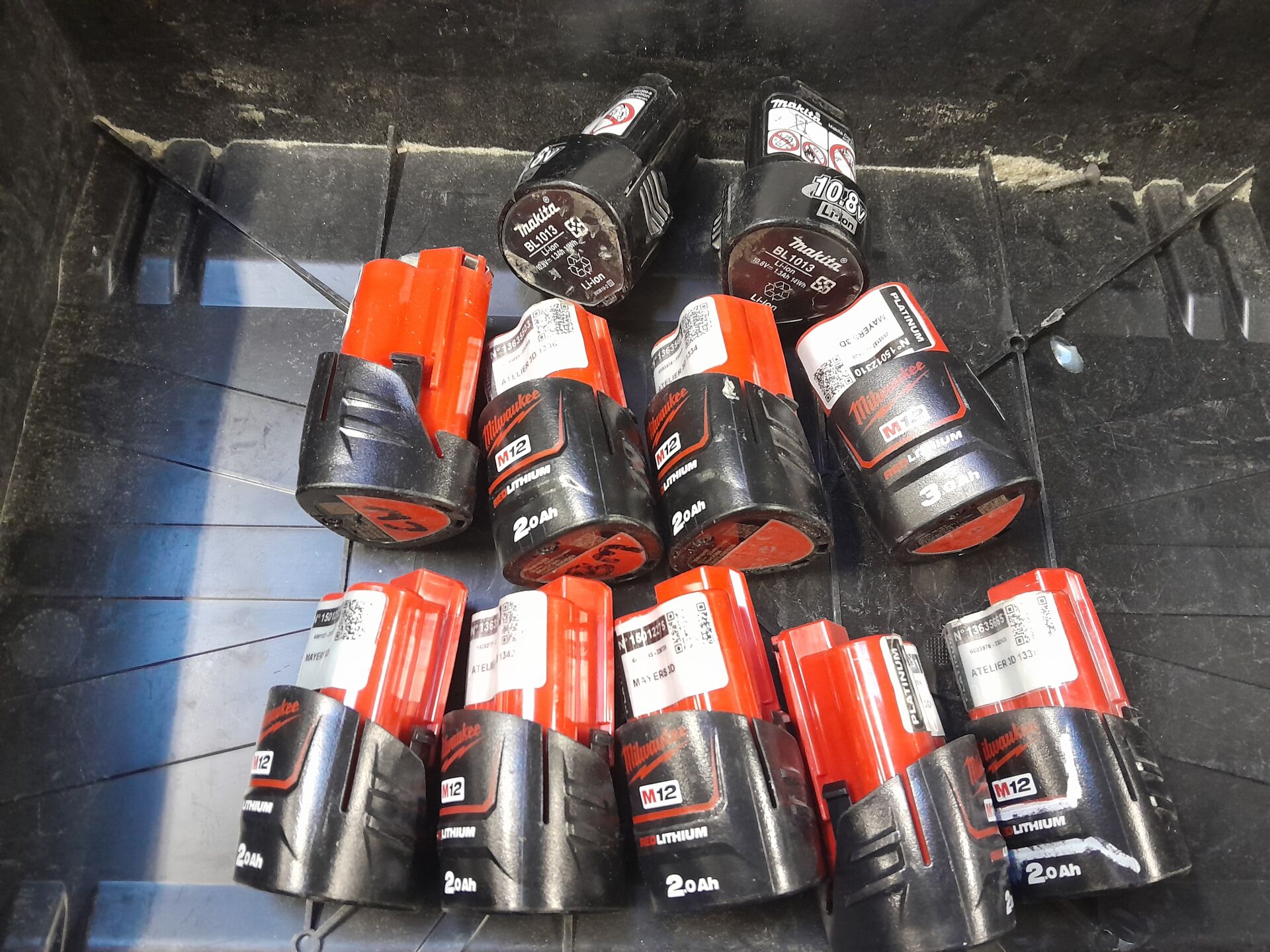 1 ensemble comprenant 9 batteries modèle M 12 2 B de marque MILWAUKEE ainsi que 2 batteries modèle BL1013 de marque MAKITA dans un coffret MILWAUKEE ( sans structure intérieure ) n/s illisible/ non renseigné
