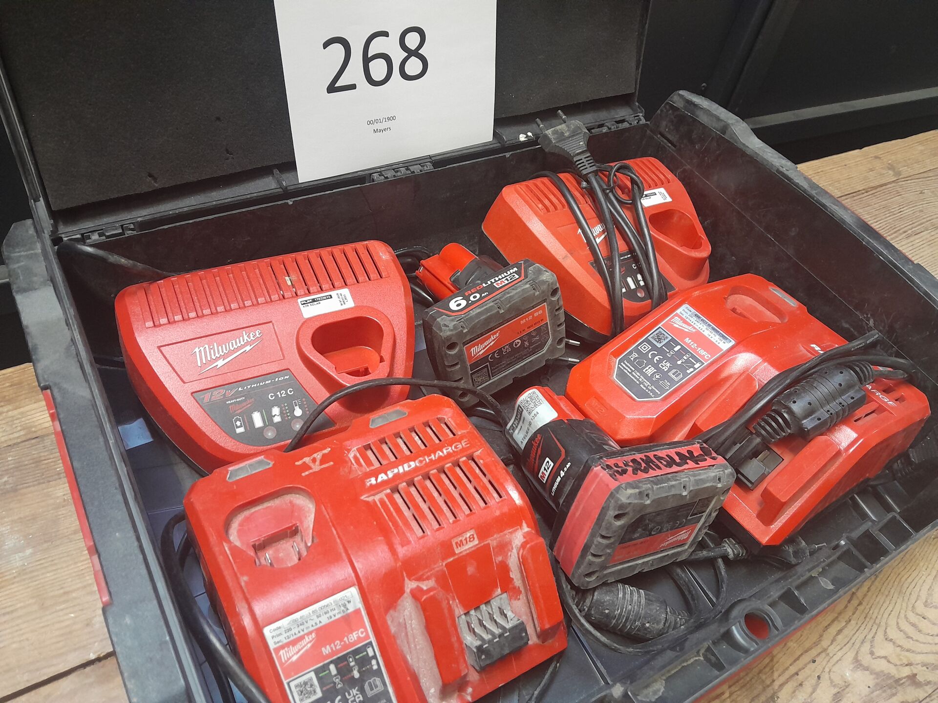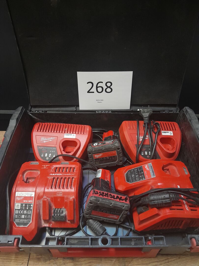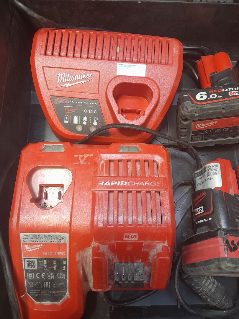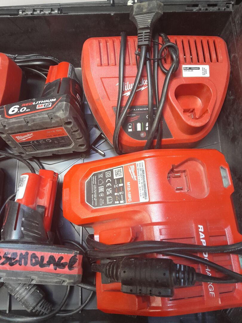 1 ensemble comprenant 2 chargeurs modèle M12-18FC , 2 chargeurs modèle C 12 C ainsi que 2 batteries modèle M 12 B4 dans un coffret ( sans structure intérieure ) le tout de marque MILWAUKEE , n/s illisible ou non renseigné
