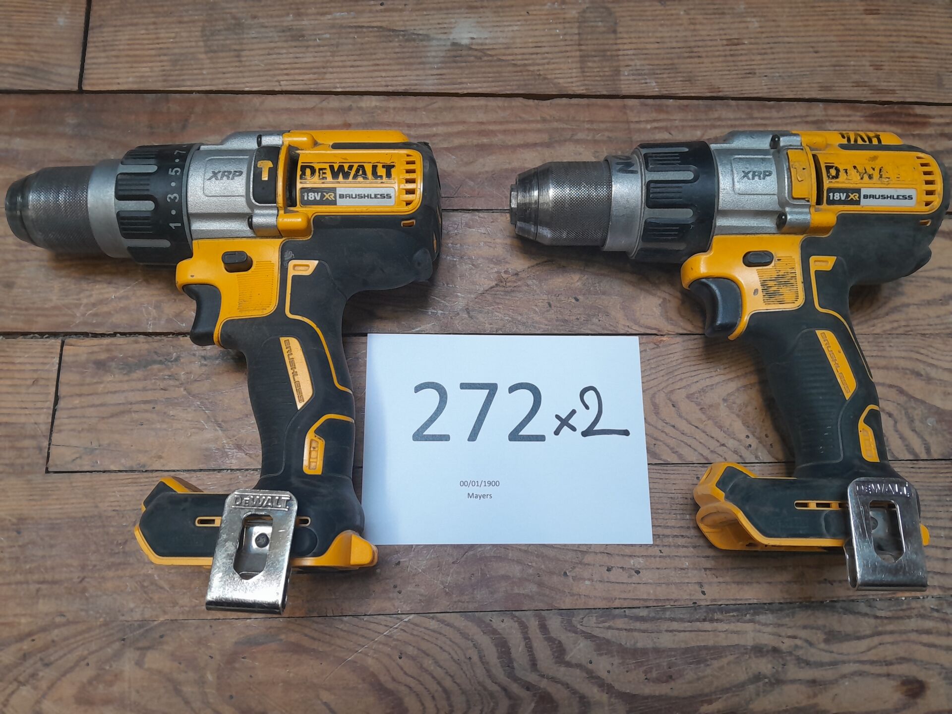 2 perceuses visseuses autonomes modèle DCD 996 de marque DEWALT sans batterie ni chargeur, N/S illisibles ou non renseignés