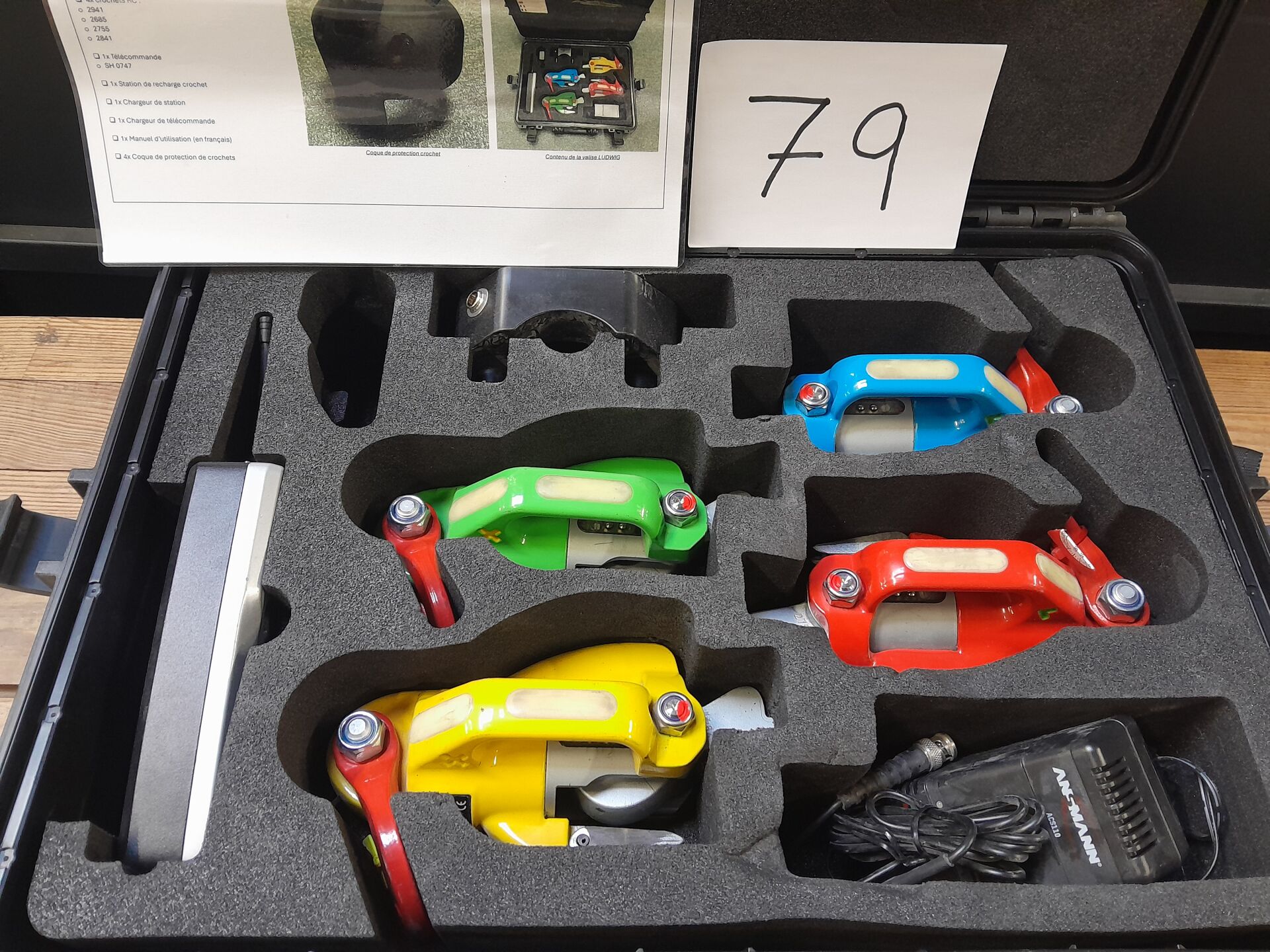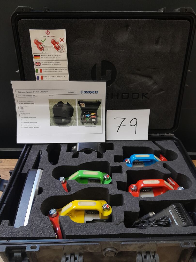 1 coffret comprenant 1 kit de décrochage automatique radiocommandé LUDWIGHOOK capacité nominale de 2 tonnes comprenant : 1 radiocommande , 4 crochets , 1 chargeur. (2023) n/s 350002