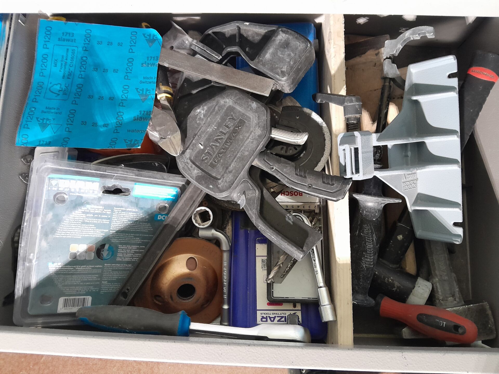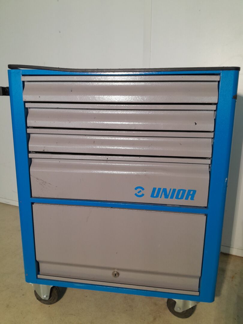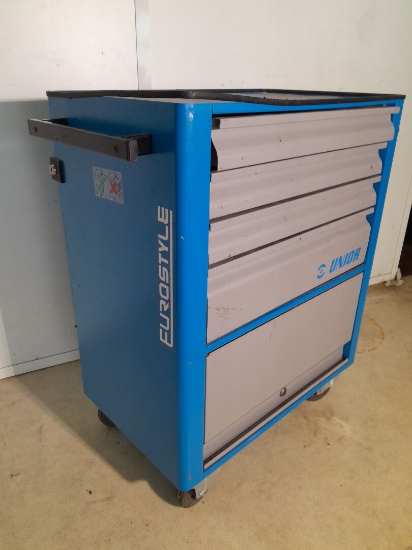 1 servante sur roulettes 4 tiroirs 1 coffre ( clef non disponible ) modèle EUROSTYLE de marque UNIOR dimensions : 76 L X 89 H X 44 cm ont y ajoute le contenu comprenant de nombreux outils dont : marteaux , tournevis etc … n/s illisible ou non renseigné