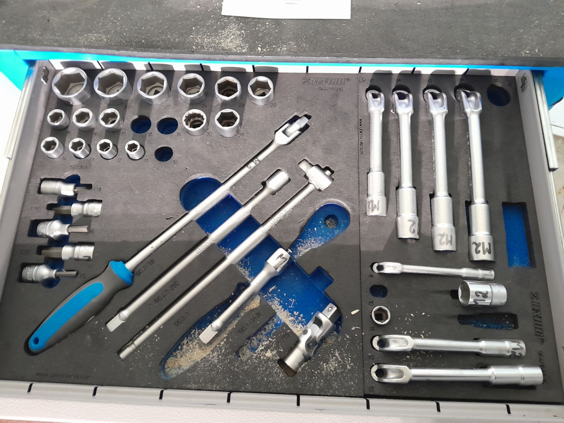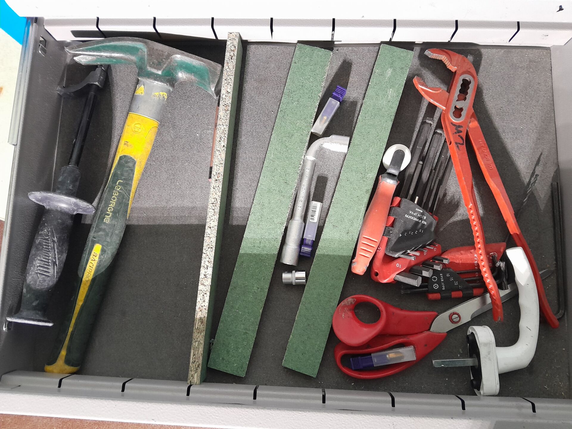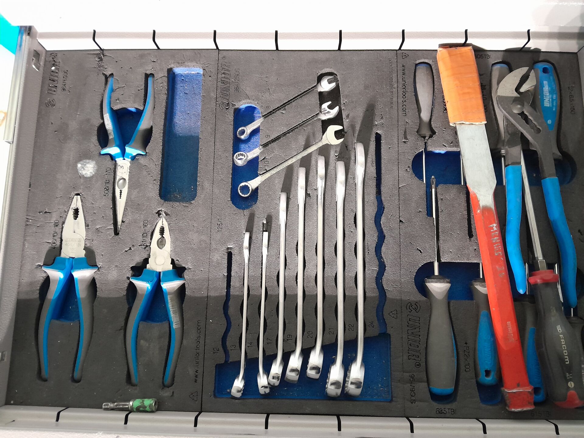 1 servante sur roulettes 4 tiroirs 1 coffre ( clef non disponible ) modèle EUROSTYLE de marque UNIOR dimensions : 76 L X 89 H X 44 cm ont y ajoute le contenu comprenant de nombreux outils dont : marteaux , tournevis etc … n/s illisible ou non renseigné