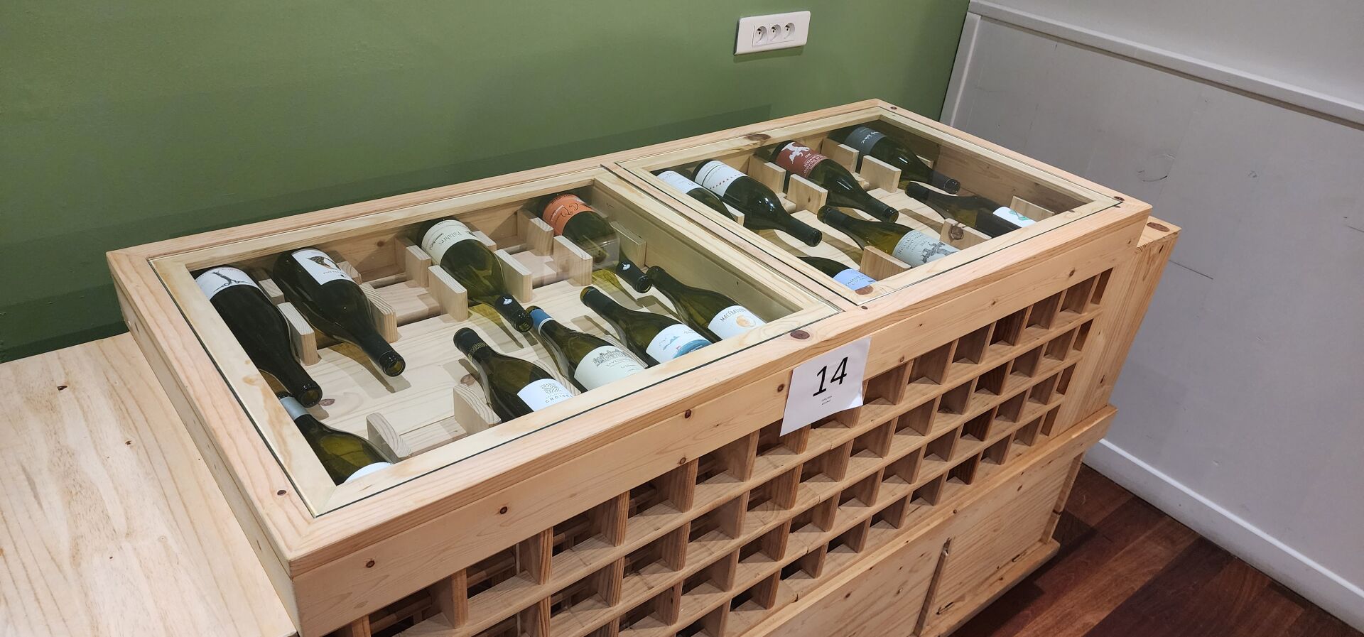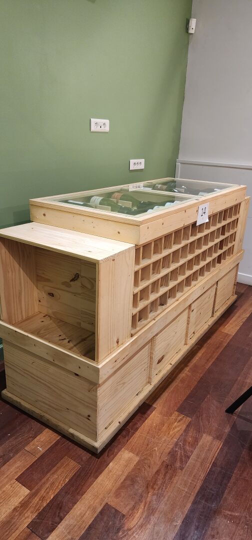 1 grand meuble de rangement chêne bi-face multi casiers fabrication maison ouvrant à 2 x4 abattants en partie basse, 200x65x102 cm avec 2 vitrines de présentation plates pour bouteilles 1 étagère de présentation en pin multi tablettes et cases, 212x90 cm
