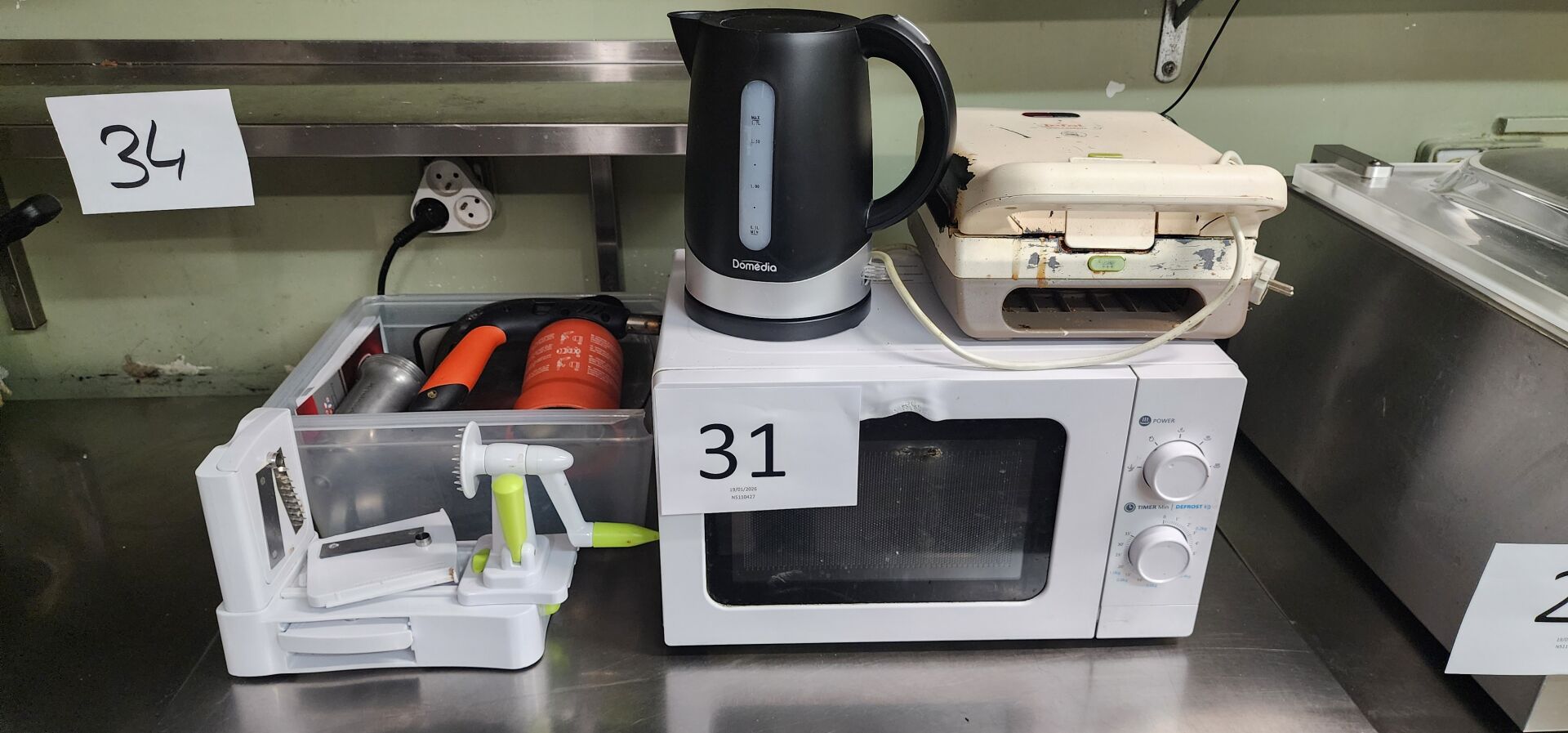 1 bouilloire DOMEDIA 1 four micro ondes sans marque apparente, état moyen 1 toaster croques monsieur, état moyen, 1 coupe-légumes