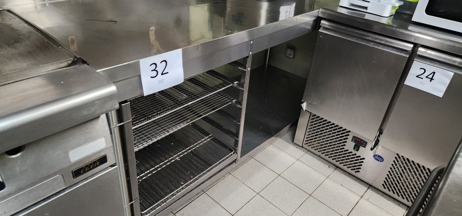 1 meuble bas inox à dosseret garni en partie gauche d"1 échelle 5 grilles, 180x71x88 cm