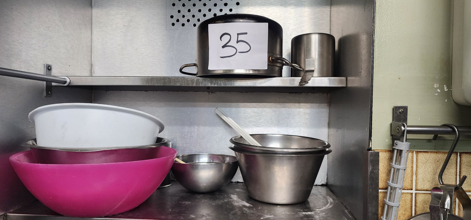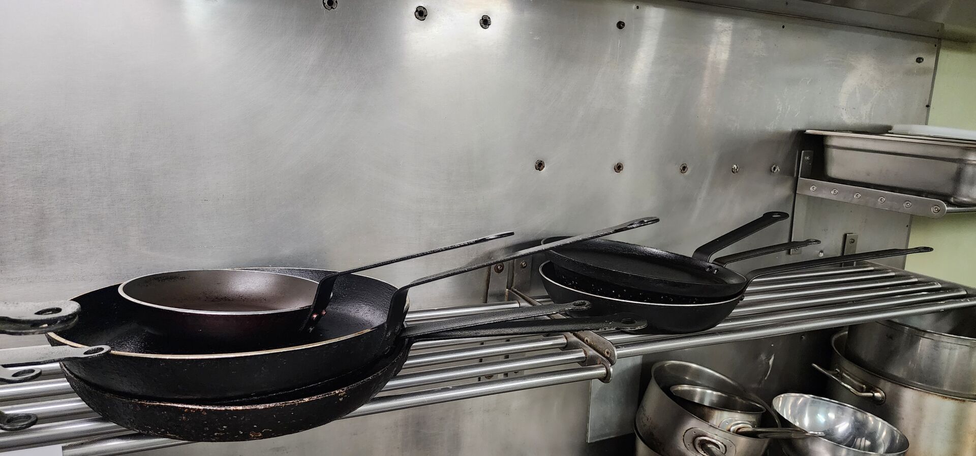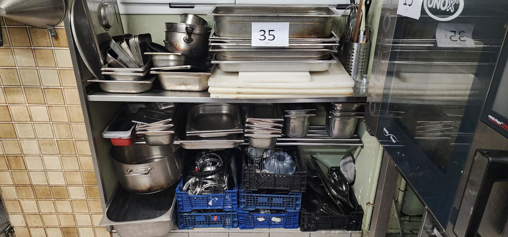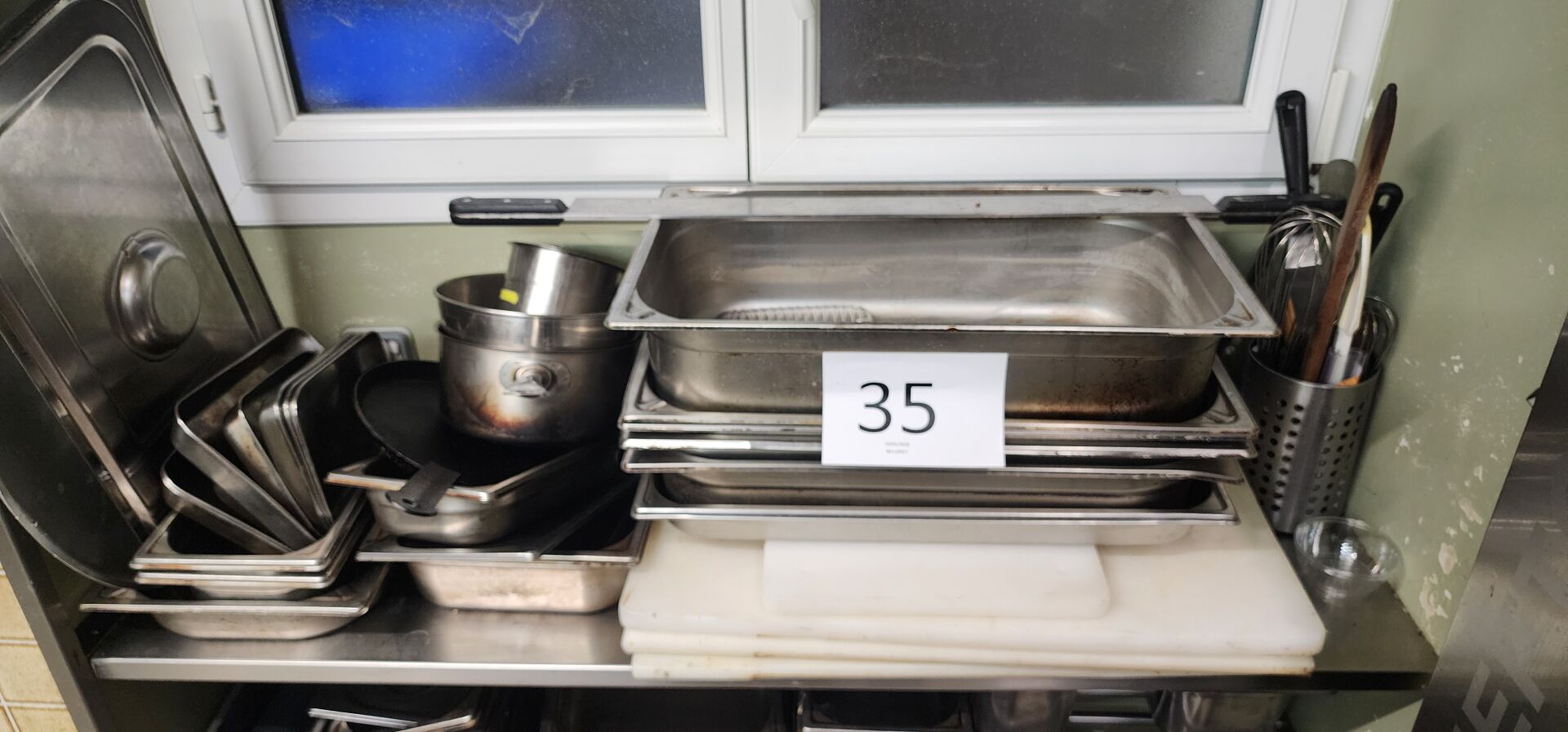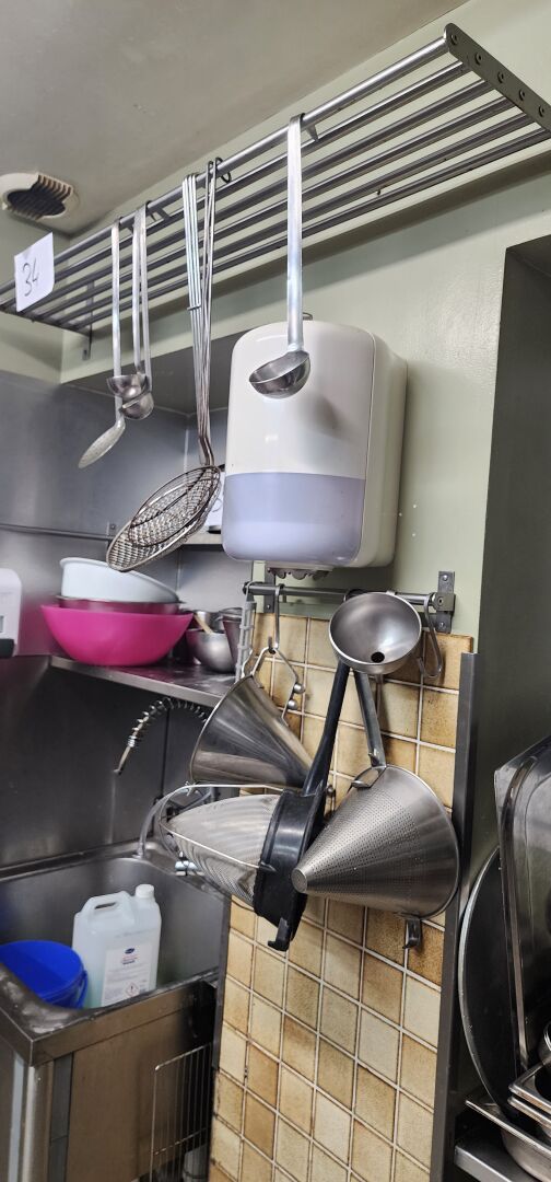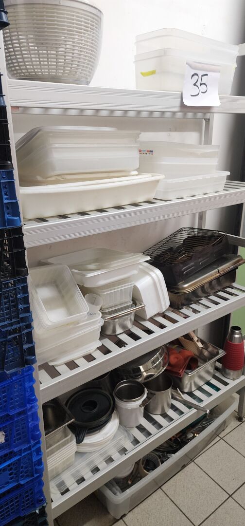 1 lot d'ustensiles de cuisine dont passoires, chinois, gamellerie, cercles, poêles, faitouts, moules en silicone, bacs gastro, bacs plastique 1 lot de plaques teflon