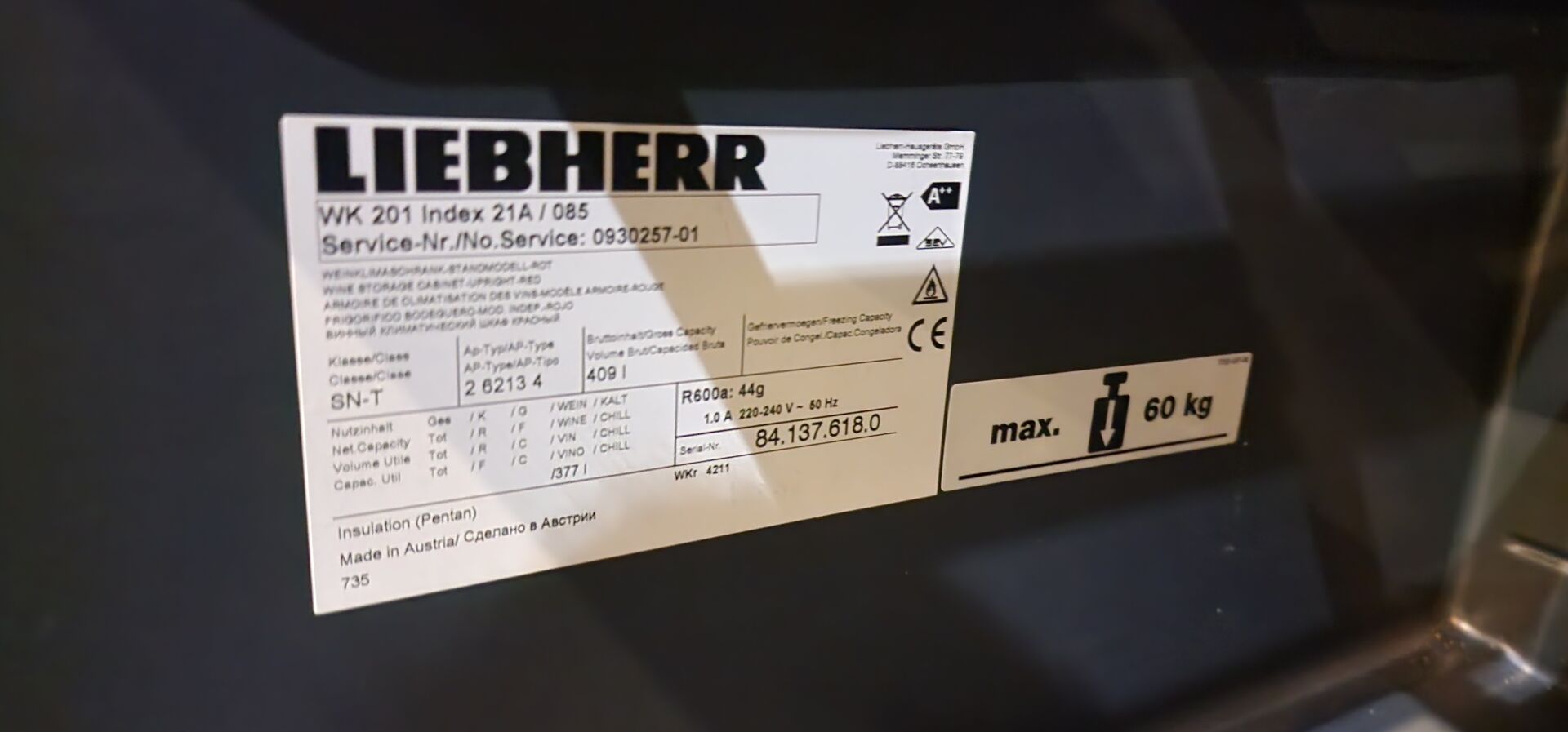1 cave à vin LIEBHERR Vinotek, 120 bouteilles 409 L 60 x 75 x 165 cm
