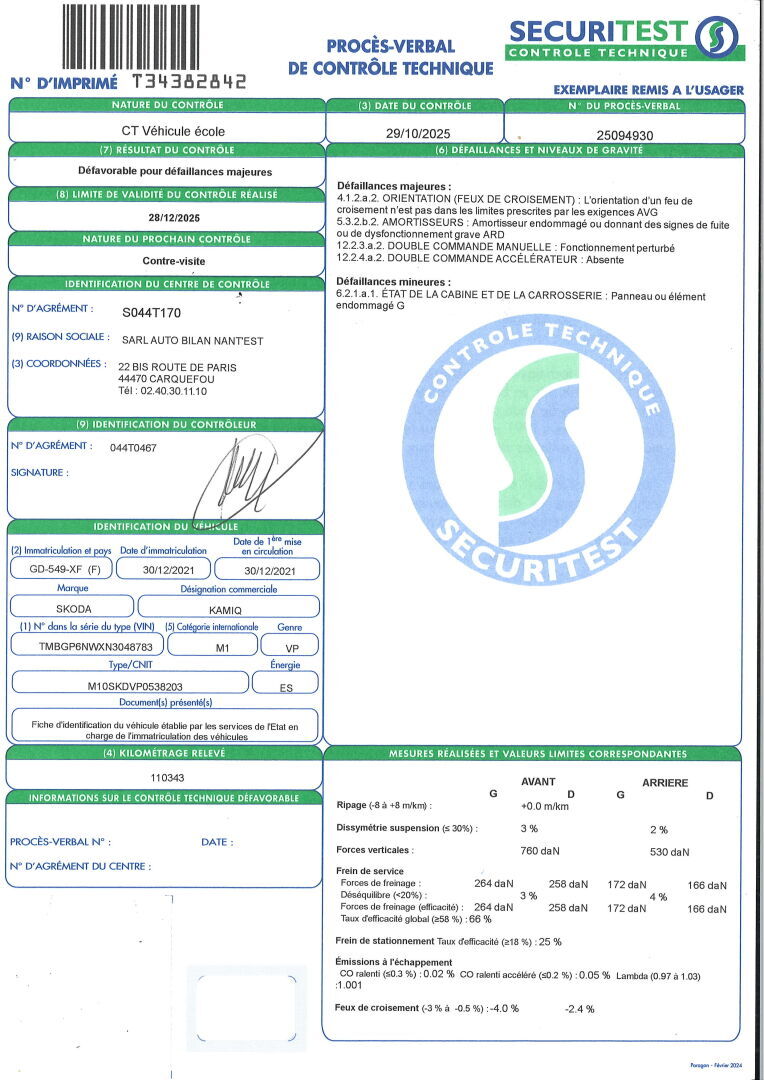 VENTE RESERVEE AUX PROFESSIONNELS DE L'AUTOMOBILE OU AUTO-ECOLES VEHICULE AVEC FIV ET NUMERO DE FORMULE. VEHICULE ECOLE - DOUBLE COMMANDE. BVM5- CLIM BI ZONES- RADIO- GPS- 4 VITRES ELECT- RETROS ELECT RABAT ET DEGIV- REGULATEUR DE VITESSES- RADAR DE RECUL- DOUBLE PEDALE DE FREIN ET EMBRAYAGE. TISSU TACHES- PLASTIQUES RAYES ET TACHES- 1 TROU DANS LE SOL COTE CONDUCTEUR. FROTTEMENTS COTE G ET D- CARROSSERIE ET JANTES RAYEES. DEFAILLANCES MAJEURES: DEFAUT D'ORIENTATION DU FEU DE CROISEMENT AVG- AMORTISSEUR ARD ENDOMMAGE OU DYSFONCTIONNEMENT GRAVE- FONCTIONNEMENT PERTUBE DE LA DOUBLE CDE MANUELLE- ACCELERATEUR DE LA DOUBLE CDE ABSCENT. DEFAILLANCES MINEURES: CARROSSERIE G ENDOMMAGEE FRAIS VOLONTAIRES 20 % HT