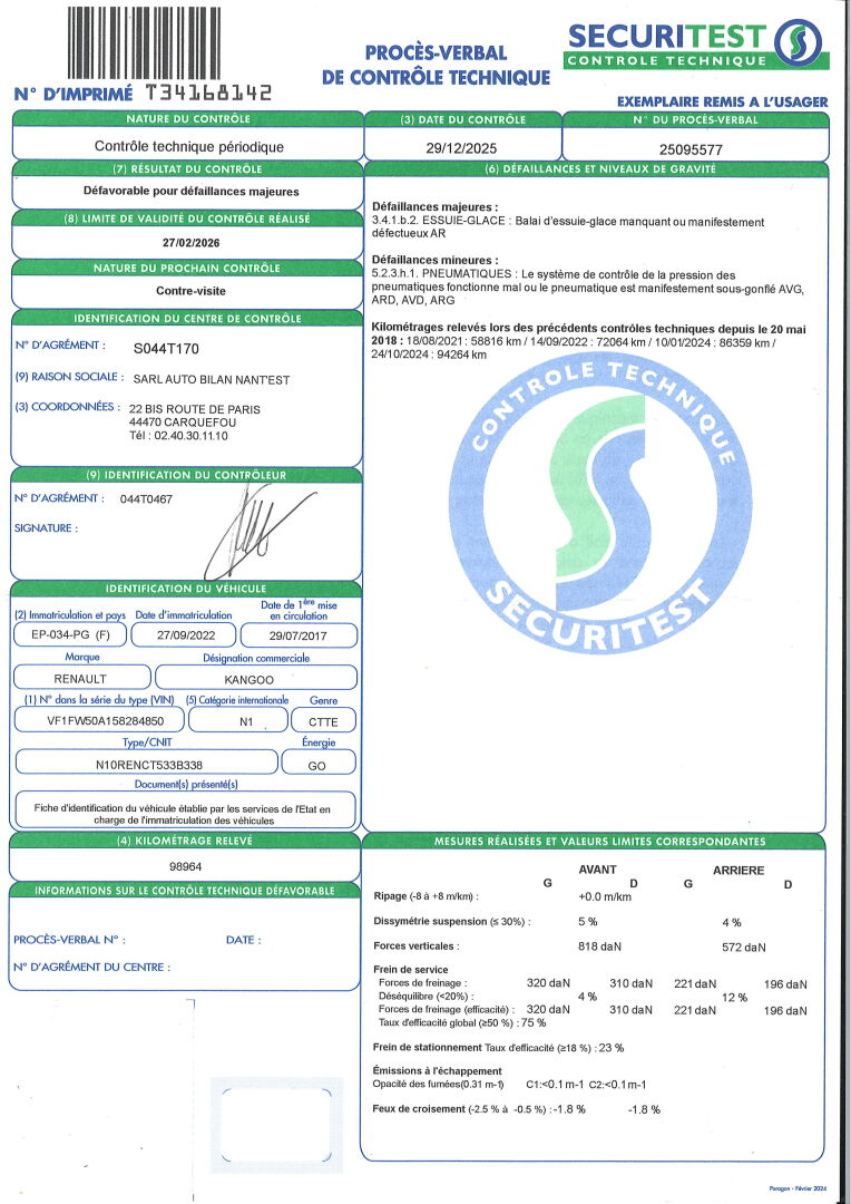 VEHICULE AVEC FIV ET NUMERO DE FORMULE. BVM5- RADIO- VITRES ET RETROS ELECT- PUB ADH. SIEGES EN TISSU TACHES. ENFONCEMENTS SUR LE TOIT- RAYURES D'USAGE- FROTTEMENT SUR LA PORTE AVD- IMPACT SUR LA VITRE AV. DEFAILLANCES MAJEURES: BALAI D'ESSUIE GLACE AR MANQUANT. DEFAILLANCES MINEURES: 4 PNEUS SOUS GONFLES. FRAIS 11.9 % HT