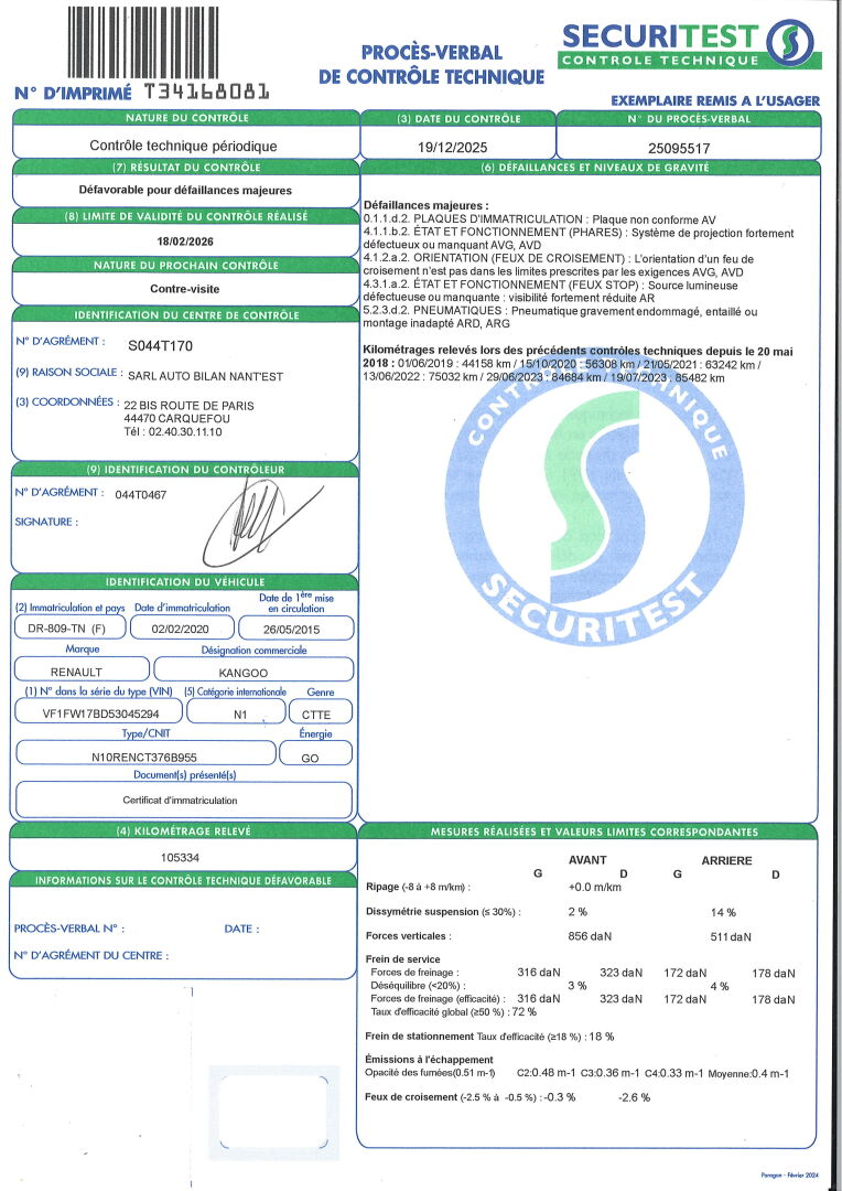 BVM5- RADIO- VITRES ET RETROS ELECT. PLASTIQUES RAYES ET TACHES. ENFONCEMENT DE LA PORTE AVG- DIFFICULTEE A FERMER LA PORTE AVG- RAYURES D'USAGE. DEFAILLANCES MAJEURES: PLAQUE D'IMMAT AV NON CONFORME- DEFAUT D'ECLAIRAGE DES FEUX AVG ET AVD- VISIBILITE FORTEMENT REDUITE DU FEU STOP AR- PNEU ARD ET ARG GRAVEMENT ENDOMMAGES. FRAIS 11.9 % HT