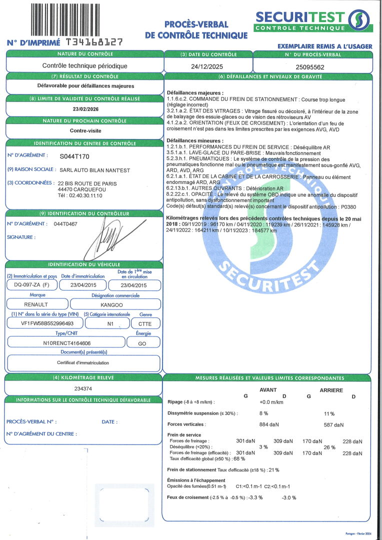 VEHICULE GAGE - DELAI OBTENTION DES PAPIERS A PREVOIR. BVM5- RADIO- VITRES ET RETROS ELECT- REGULATEUR DE VITESSES- CAISSE BOIS AVEC RGT- BARRES DE TOIT. SIEGES EN TISSU TACHES- PLASTIQUES RAYES ET TACHES- TROUS DANS LE SIEGE CONDUCTEUR. PARE BRISE FISSURE- FROTTEMENTS ET ENFONCEMENTS: AILE ARG, PORTE AR ET AILE ARD. DEFAILLANCES MAJEURES: COURSE TROP LONGUE DU FREIN DE STATIONNEMENT- VITRE FISSUREE DU RETRO AV- DEFAUT D'ORIENTAION DES FEUX DE CROISEMENT AVG ET AVD. DEFAILLANCES MINEURES: DESEQUILIBRE DU FREIN DE SERVICE AR- MAUVAIS FONCTIONNEMENT DU LAVE GLACE DU PARE BRISE- 4 PNEUS SOUS GONFLES- DETERIORATION PORTE AR- DZFAUT D'OPACITE. FRAIS JUDICIAIRES 11.9 % HT