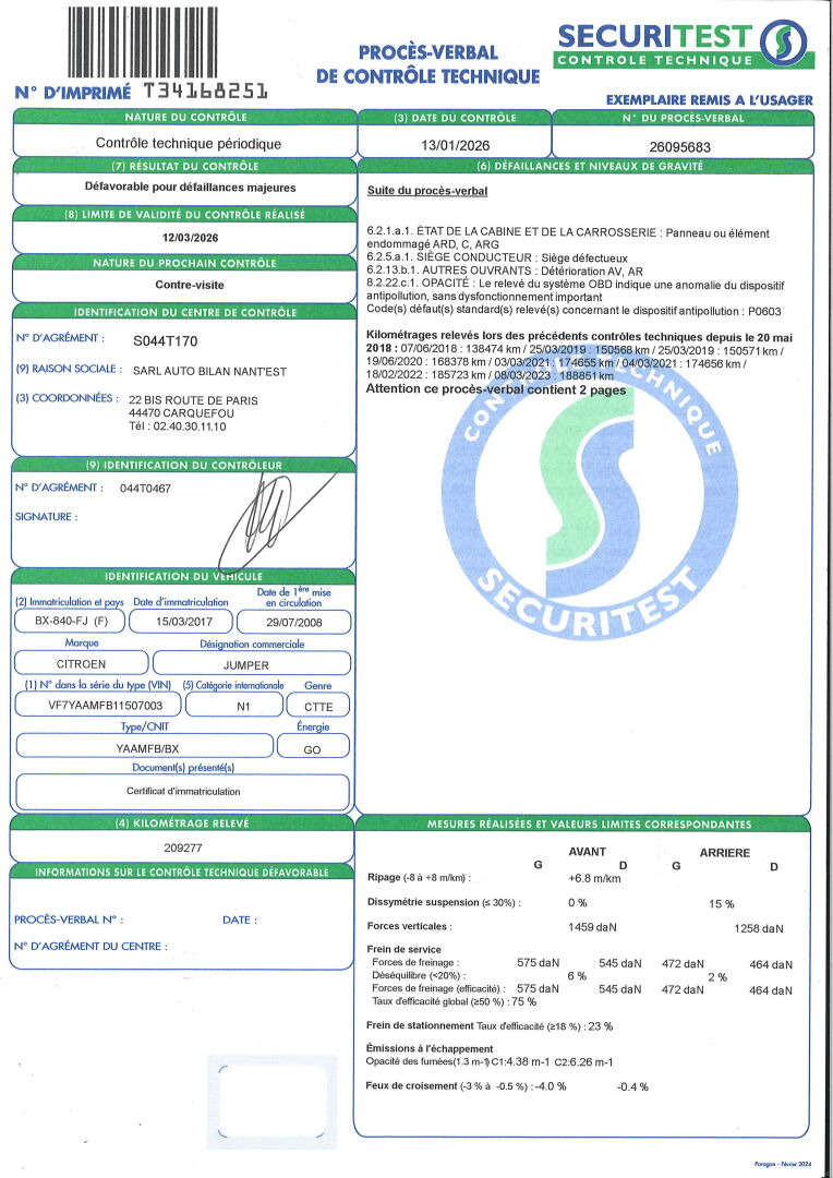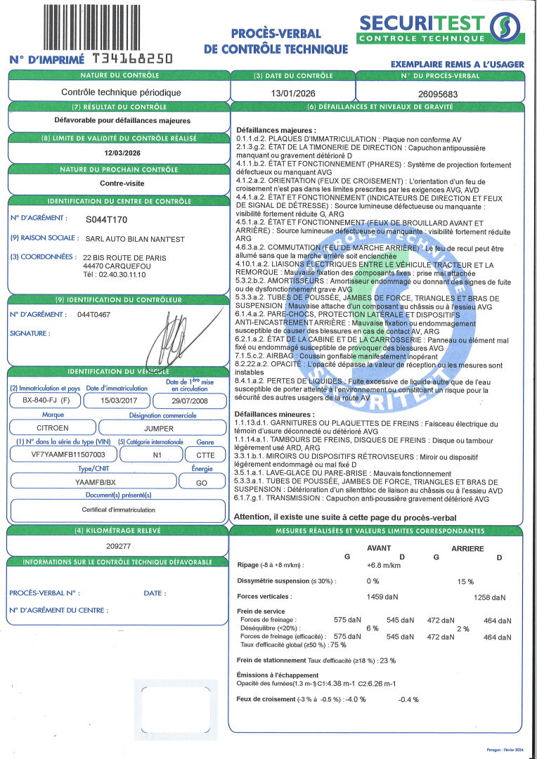 EXPOSITION DU VEHICULE LE 22/01/2026 DE 8H00 A 9 H00 AU 17 RUE DE L'OUCHE BURON A NANTES- ENLEVEMENT SUR RDV. BVM5- VITRES ET RETROS ELECT- CAISSE BOIS AVEC RGT- PUB ADH- GALERIE- ATTELAGE REMORQUE. HABITACLE SALE- SIEGES EN TISSU TACHES- SIEGE CONDUCTEUR DECHIRE. FEU AVG CASSE- RETRO D CASSE- PARE CHOCS AV ET AR CASSE- AILE AVG ENFONCEE- FROTTEMENT SUR L'AILE ARG- PORTE LAT ENFONCEE. DEFAILLANCE MAJEURE: PLAQUE D'IMMAT AV NON CONFORME- CAPUCHON ANTI POUSSIERE DE LA TIMONERIE ABSCENT- ECLAIRAGE AVG DEFECTUEUX- DEFAUT D'ECLAIRAGE AVG ET AVD- VISIBILITE FORTEMENT REDUITE DES FEUX DE DETRESSE G ET ARG- LE FEU DE RECUL PEUT RESTE ALLUME- DEFAUT ELECTRIQUE DE L'ATTACHE REMORQUE- AMORTISSEUR AVG ENDOMMAGE- MAUVAISE ATTACHE D'UN COMPOSANT AU CHASSI OU A L'ESSIEU- CARROSSERIE AVG ENDOMMAGEE- DEFAUT D'OPACITE- FUITE D'HUILE. DEFAILLANCES MINEURES: DEFAUT ELECTRIQUE DU FREIN AVG- DISQUE OU TAMBOUR DE FREIN ARD ET ARG LEGEREMENT USES- MIROIR DU RETRO D ENDOMMAGE- MAUVAIS FONCTIONEMENT DU LAVE GLACE- CARROSSERIE ARD, C ET ARG ENDOMMAGEE- SIEGE CONDUCTEUR DEFECTUEUX- DETERIORATION OUVRANT AV ET AR- DEFAUT D'OPACITE. FRAIS JUDICIAIRES 11.9 % HT